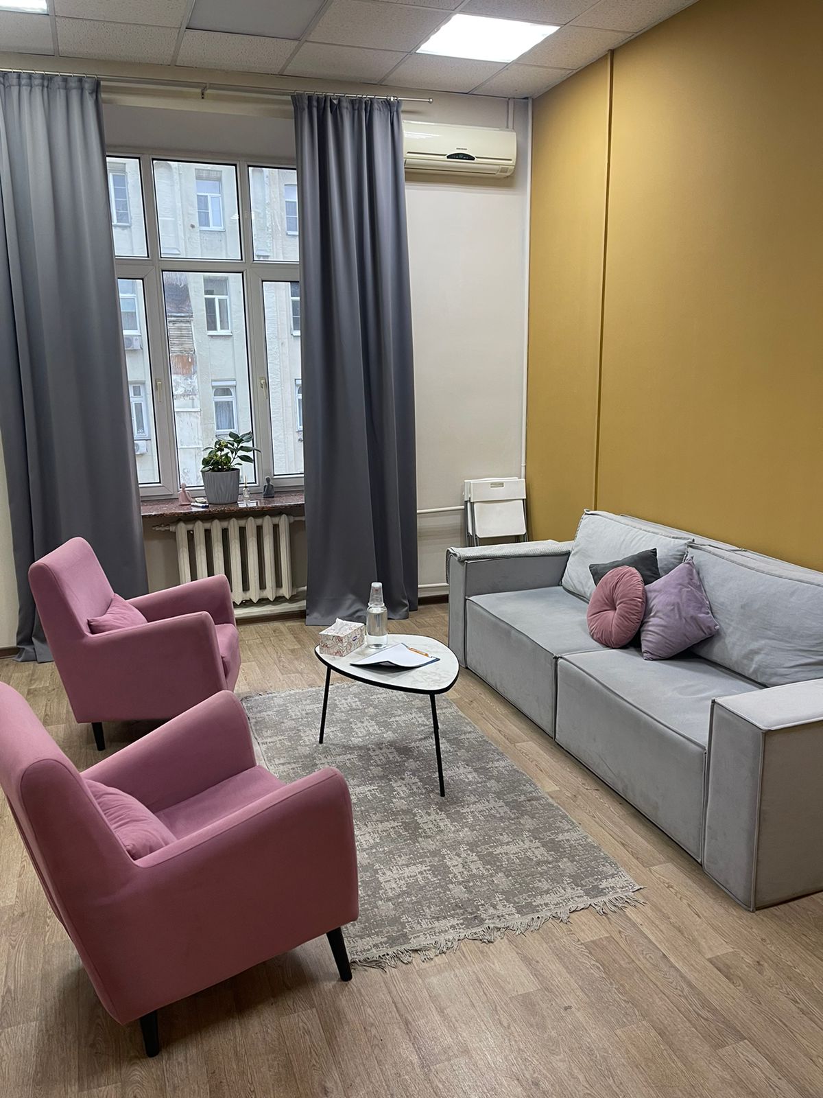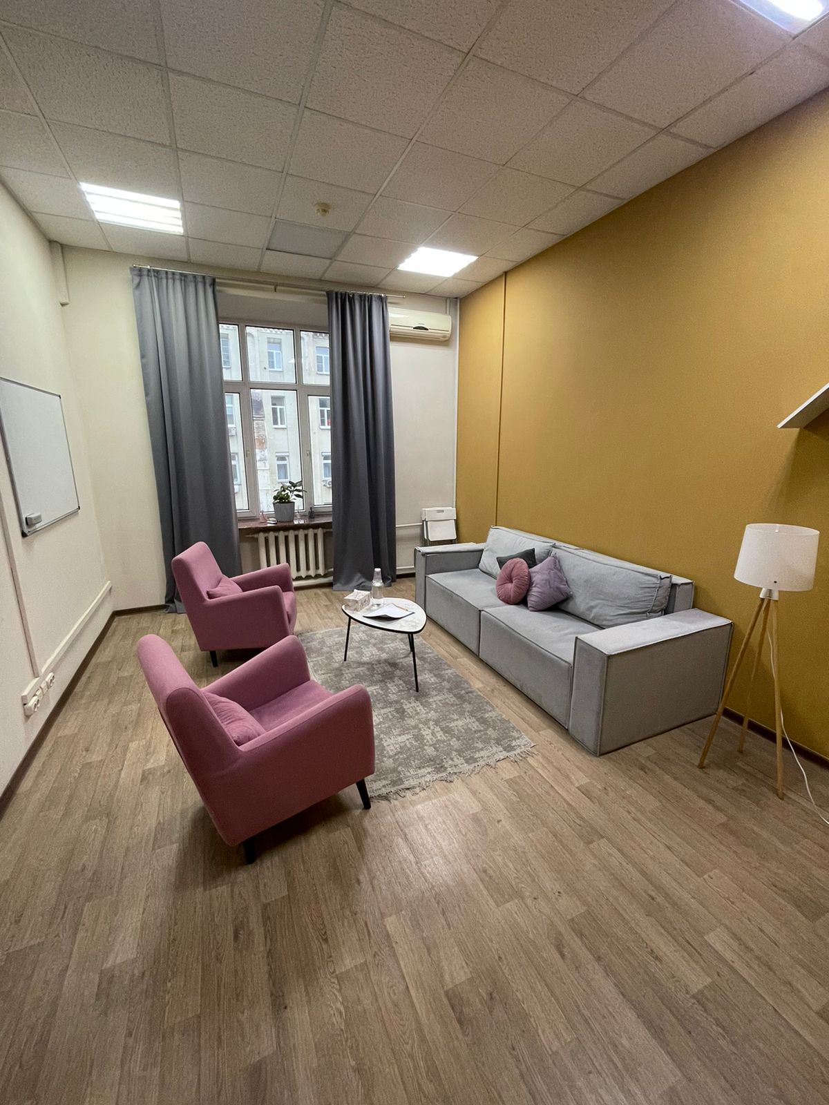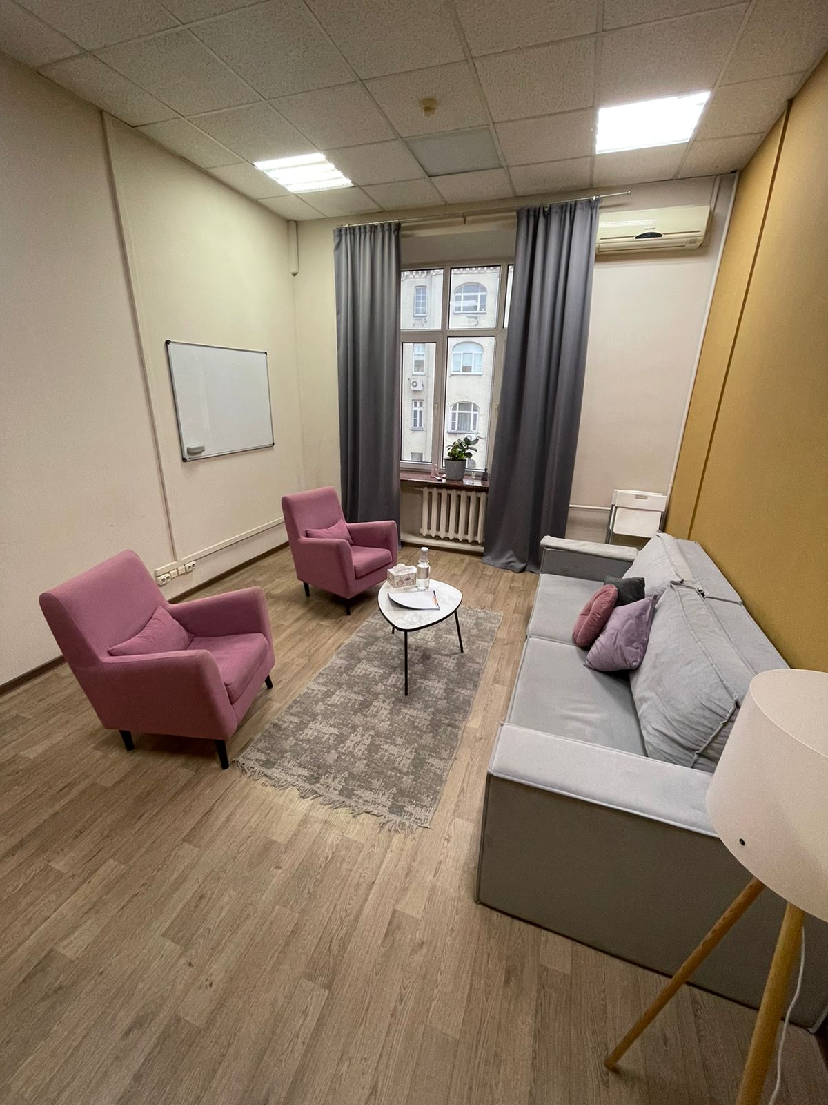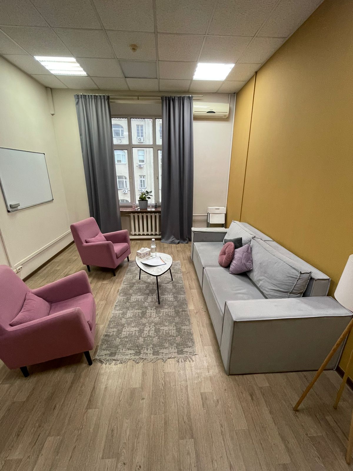 Кабинет предназначен для групповых занятий и тренингов. По предварительному запросу, кабинеты можно комплектовать дополнительными стульями.