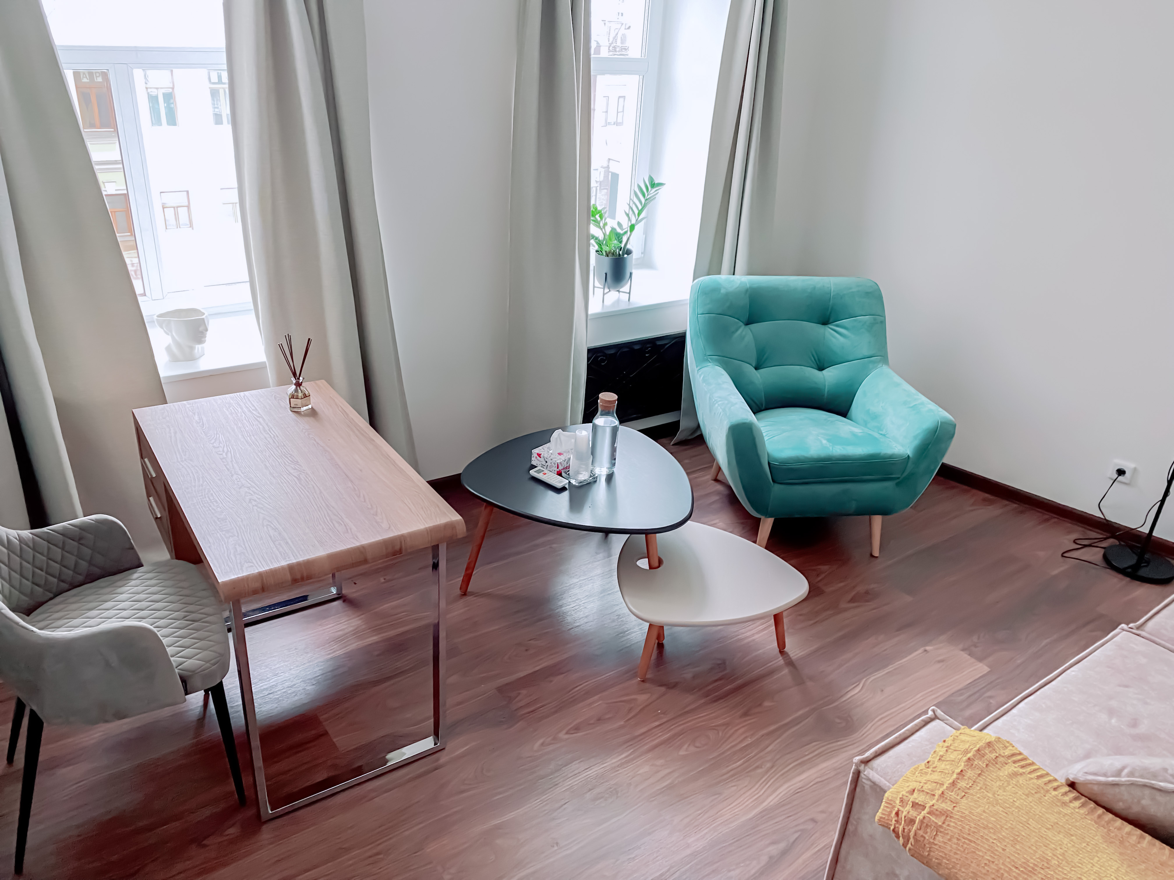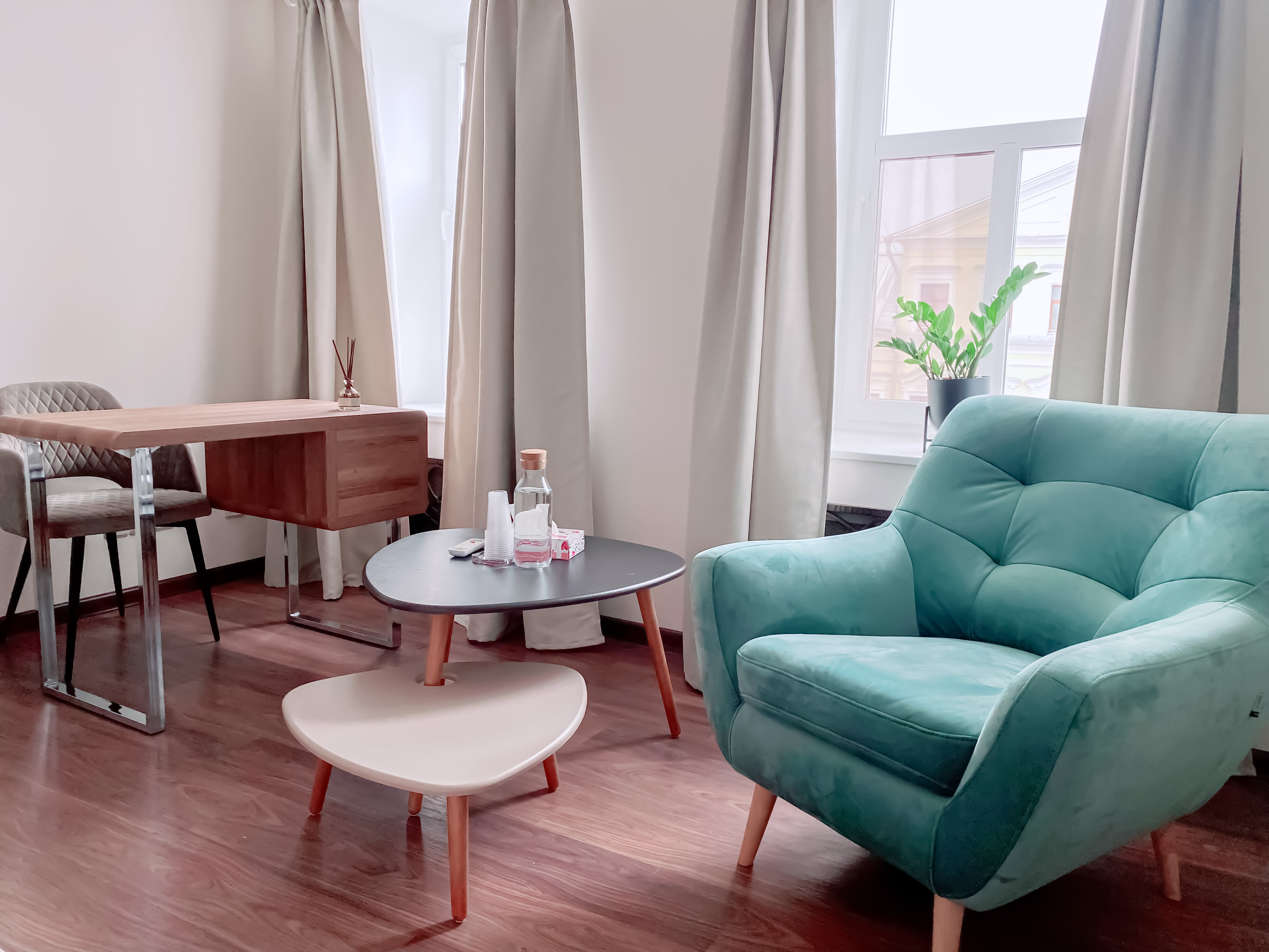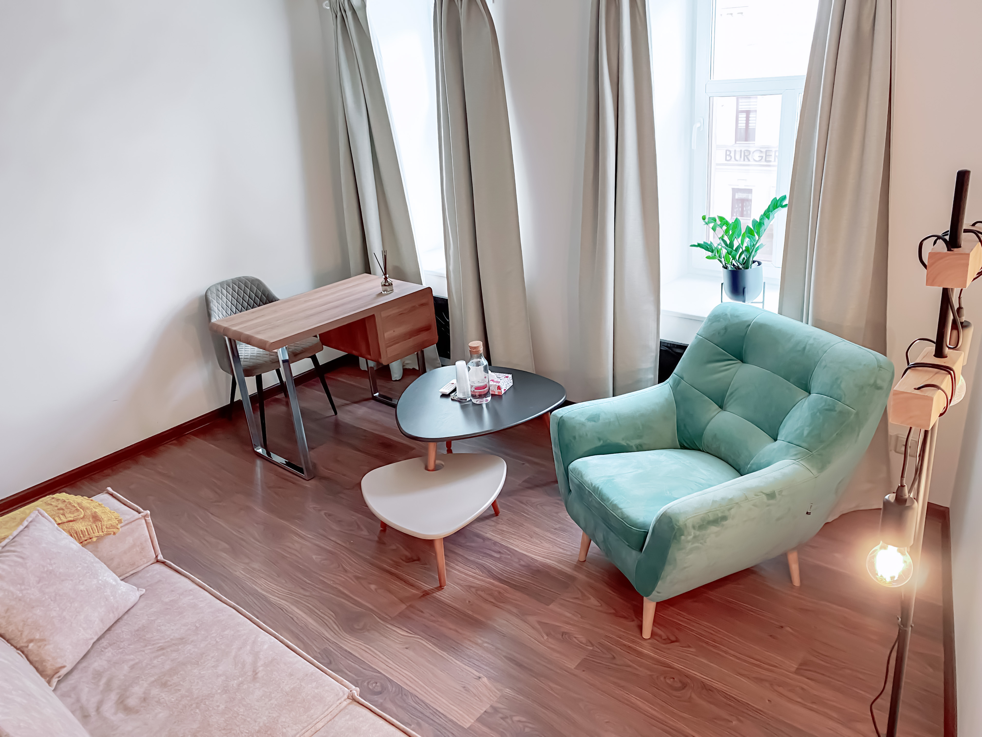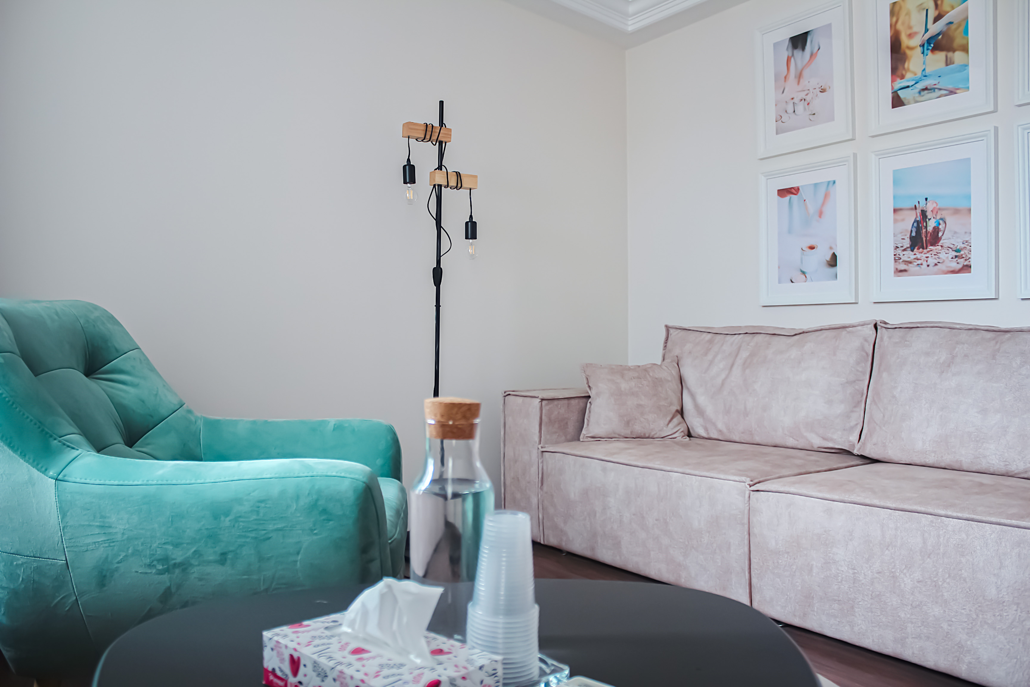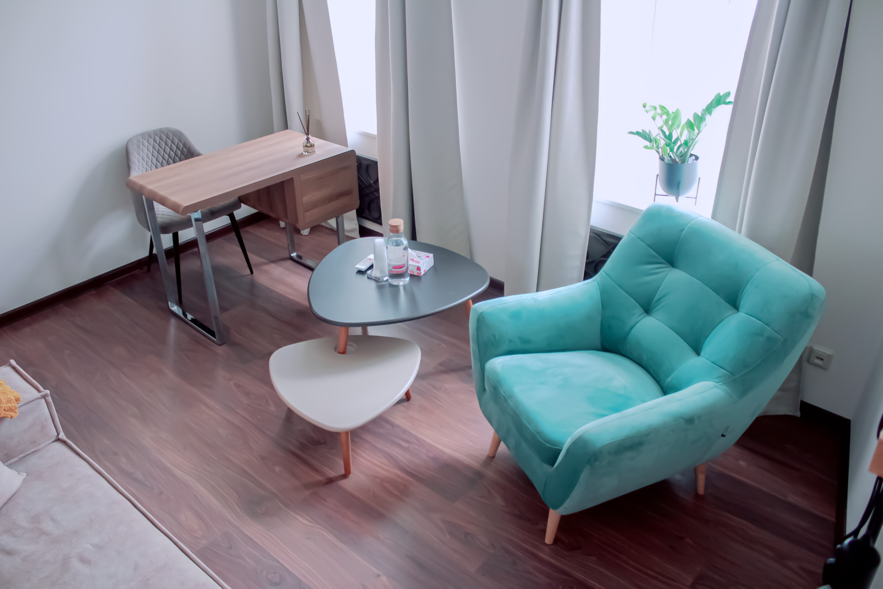 Светлый кабинет с 2-мя окнами. В нем комфортно работать в индивидуальной терапии и с семьями благодаря удобному дивану и большому креслу. Рабочий стол со стулом позволяют использовать его, как рабочий кабинет и проводить онлайн встречи. Современный дизайн интерьера подчеркивает необычный торшер, современные картины на стенах и живые растения.