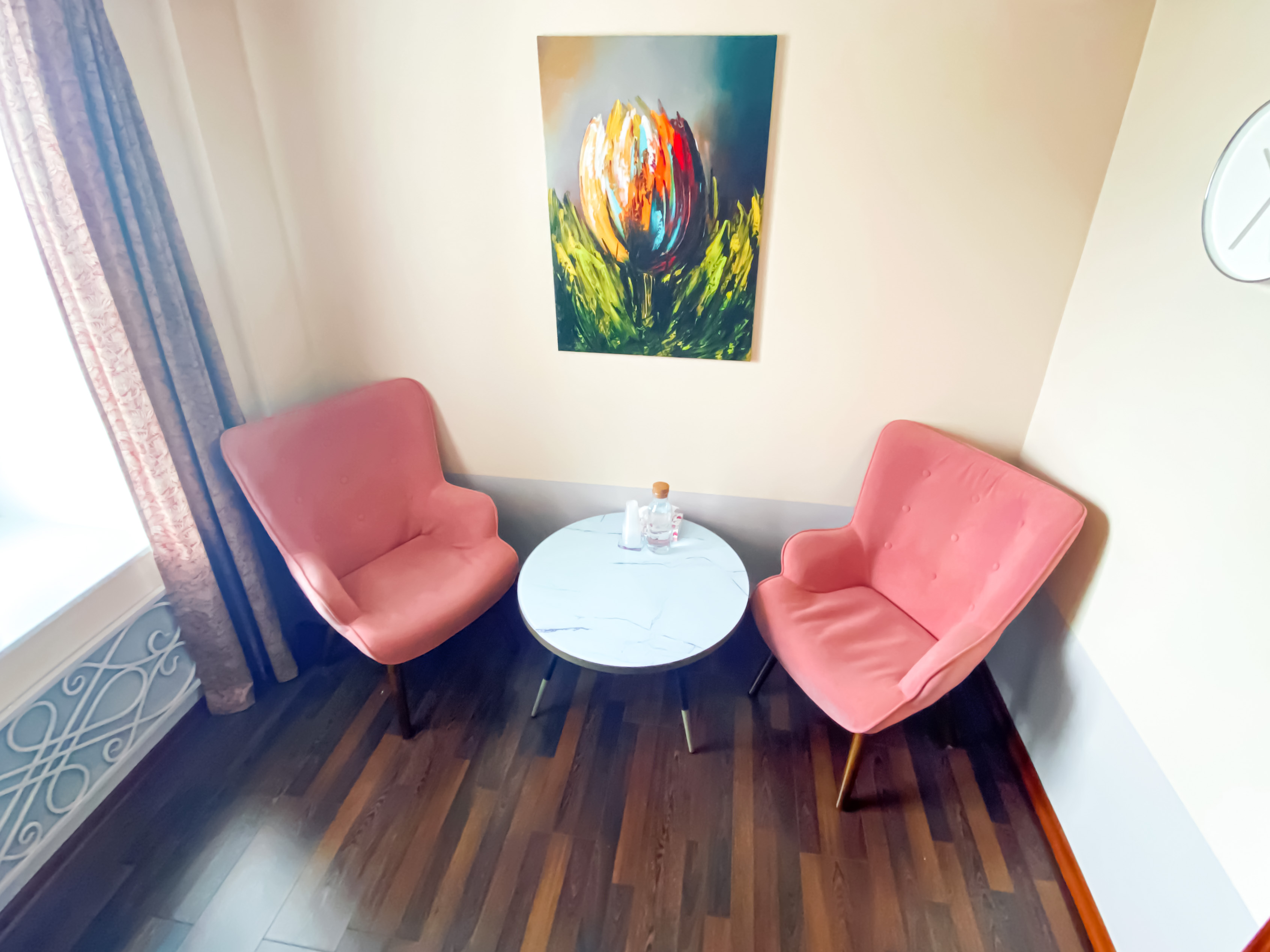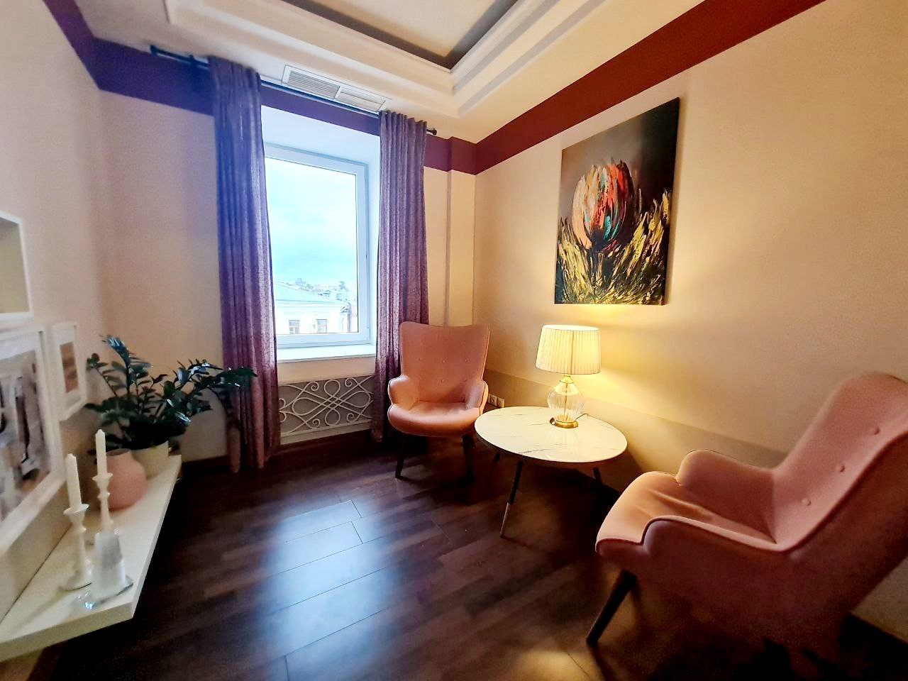 В кабинете 2 удобных кресла, журнальный столик и настольная лампа, дающая мягкий приглушенный свет. Общая цветовая гамма пространства выдержана в пудровых тонах, с оригинальным оформлением потолка и стен. Также есть комнатные растения. В кабинете уютно и тепло. Создана обстановка для доверительной работы психолога и его посетителя.