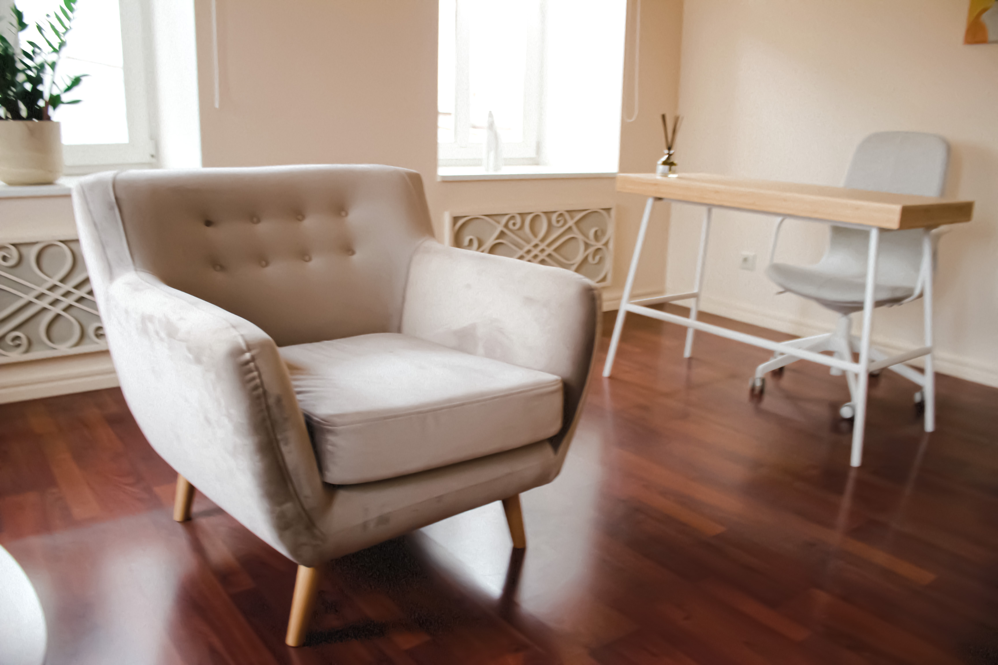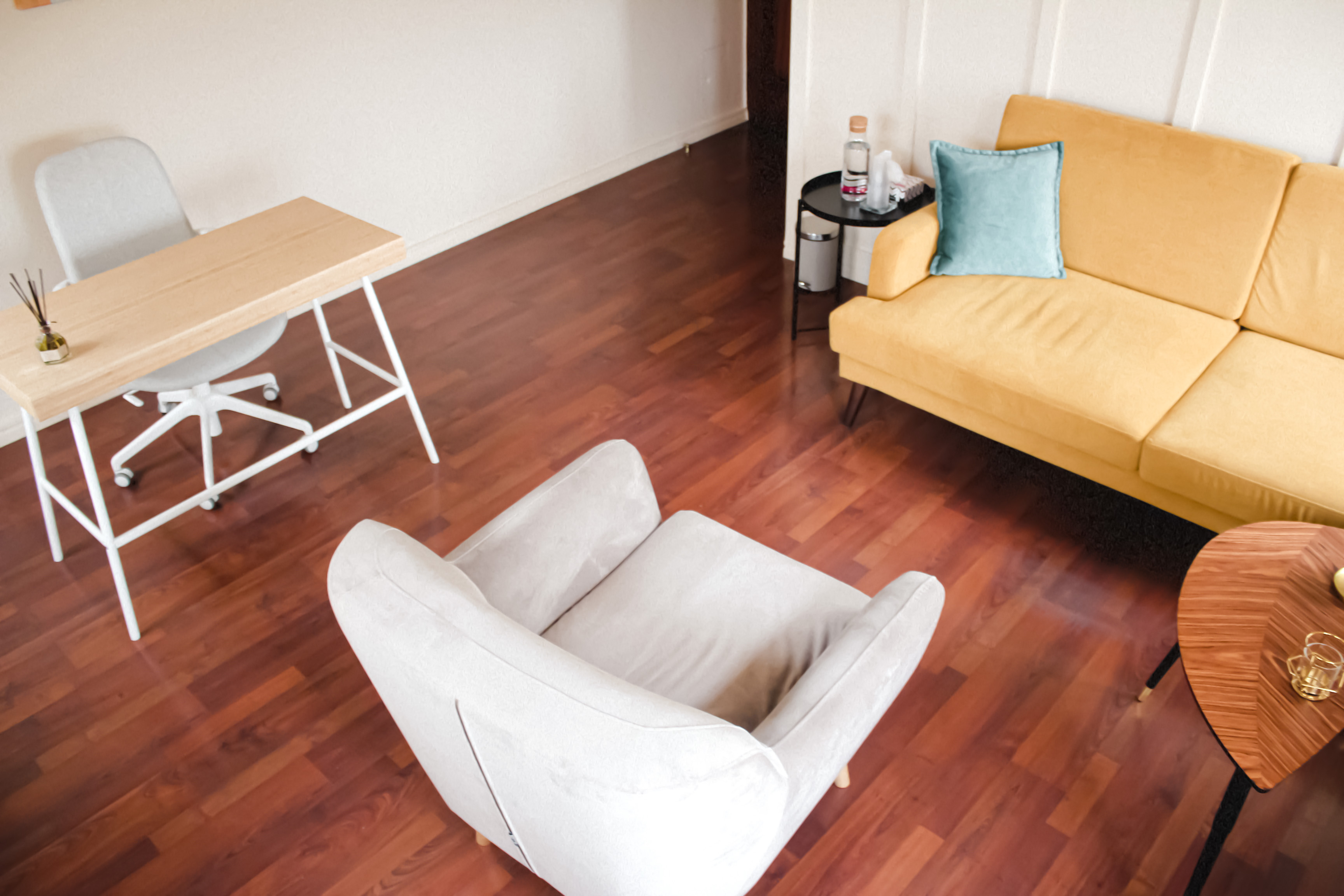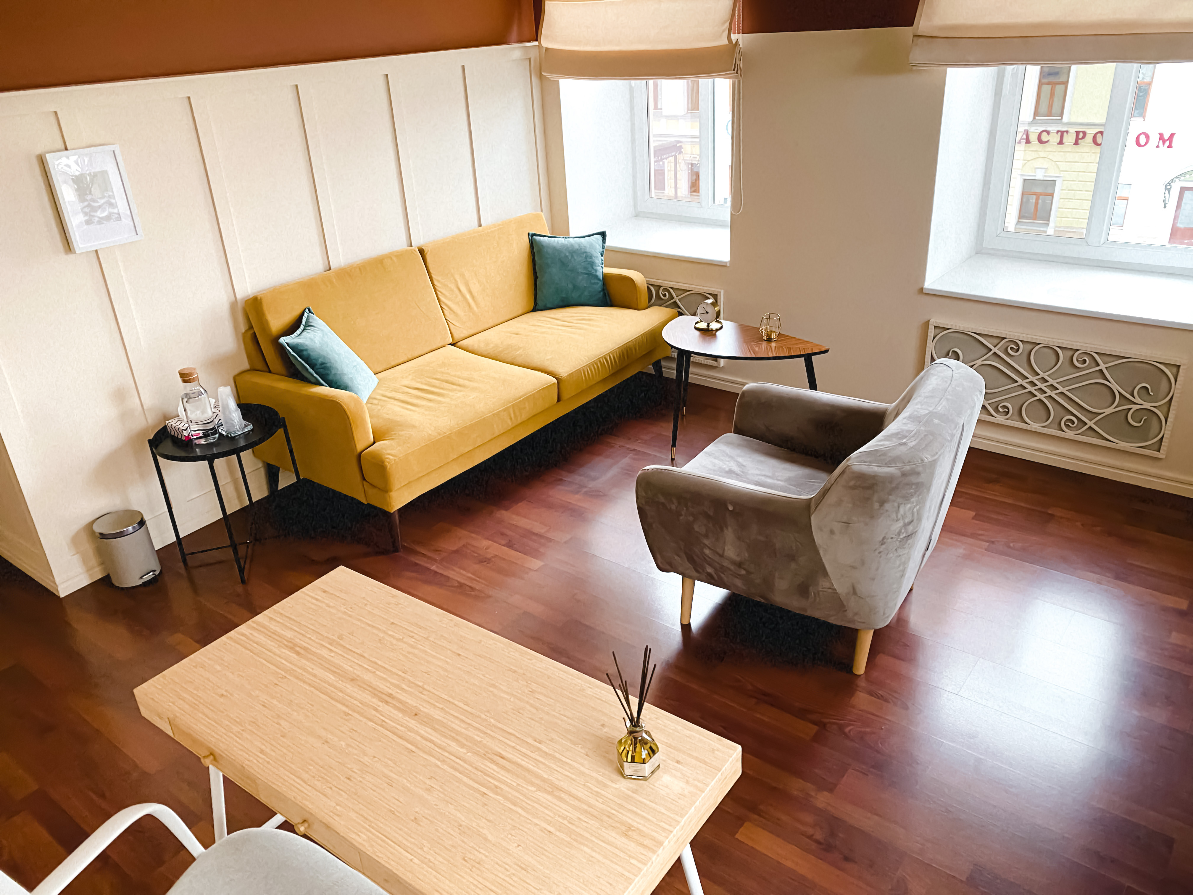 Просторный, светлый угловой кабинет с 4-мя окнами, создающими панораму на Таганскую площадь. Общая цветовая гамма пространства выдержана в бежево-коричневых тонах, с оригинальным желтым диваном, письменным столом, стулом и дополнительным удобным креслом. Кабинет подойдет для индивидуальной работы, а также для работы с семьями семейных консультаций.
