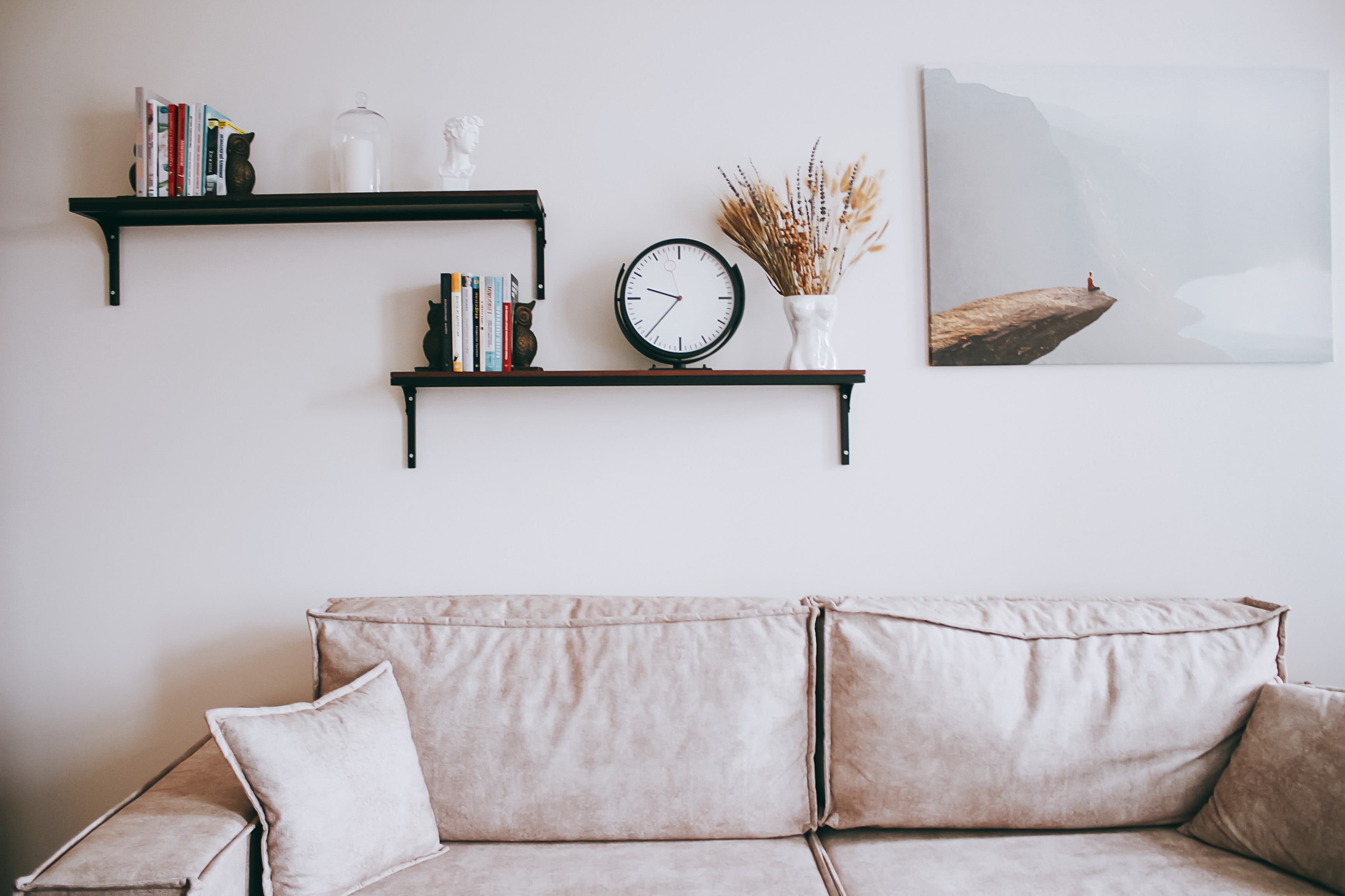 Светлый кабинет с диваном, письменным столом, креслом и 2-мя окнами. Цветовая гамма выдержана в бежевых тонах. Мягкое освещение торшера помогает создать атмосферу уюта и спокойствия для комфортной работы.
