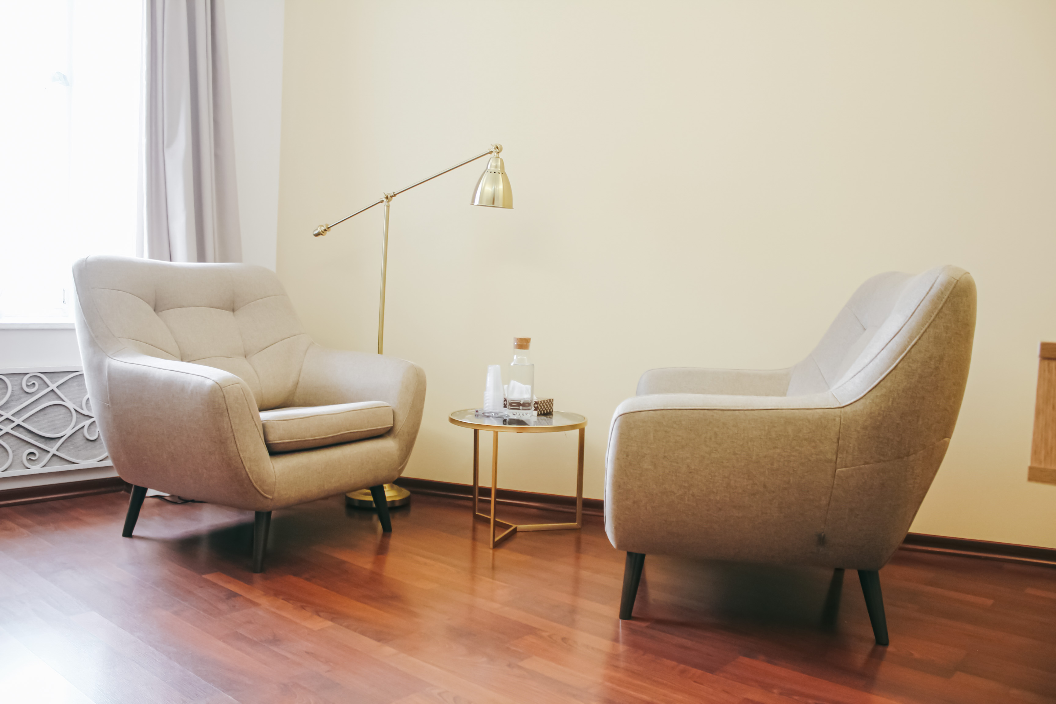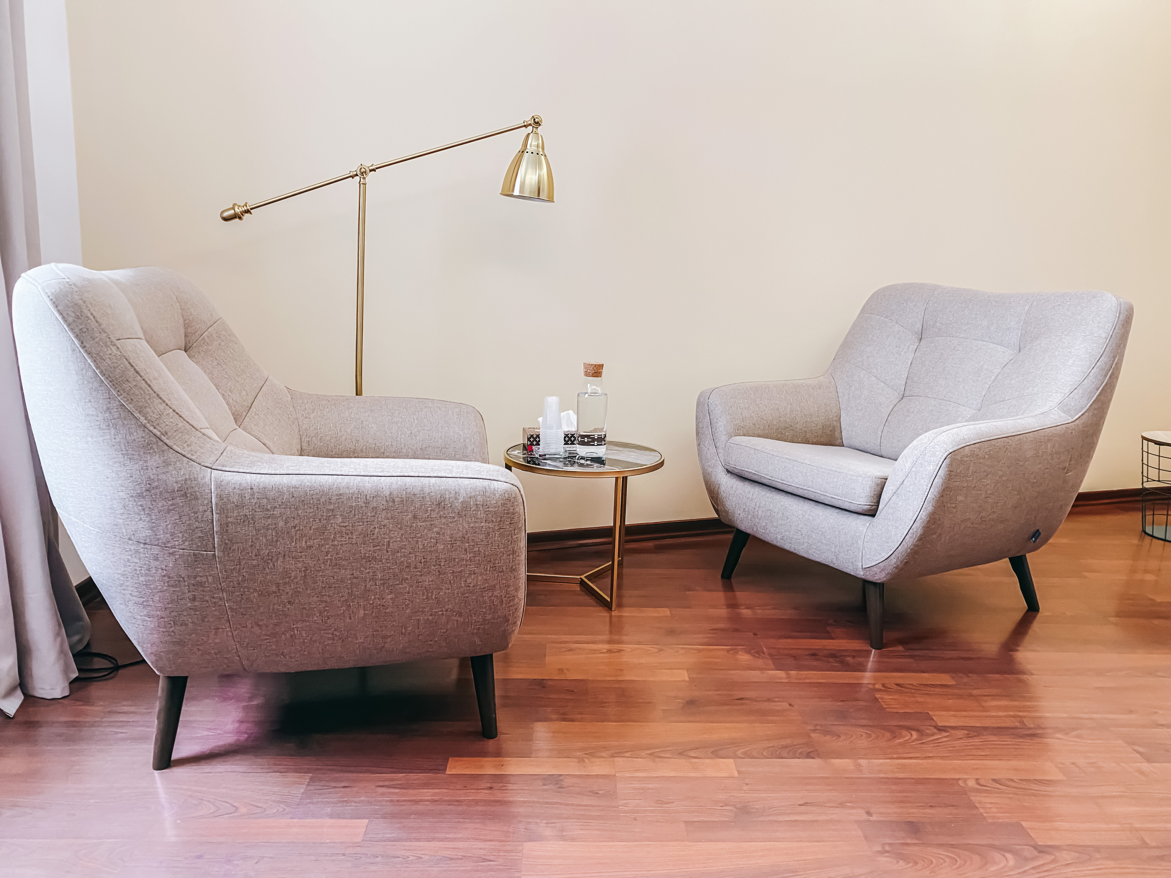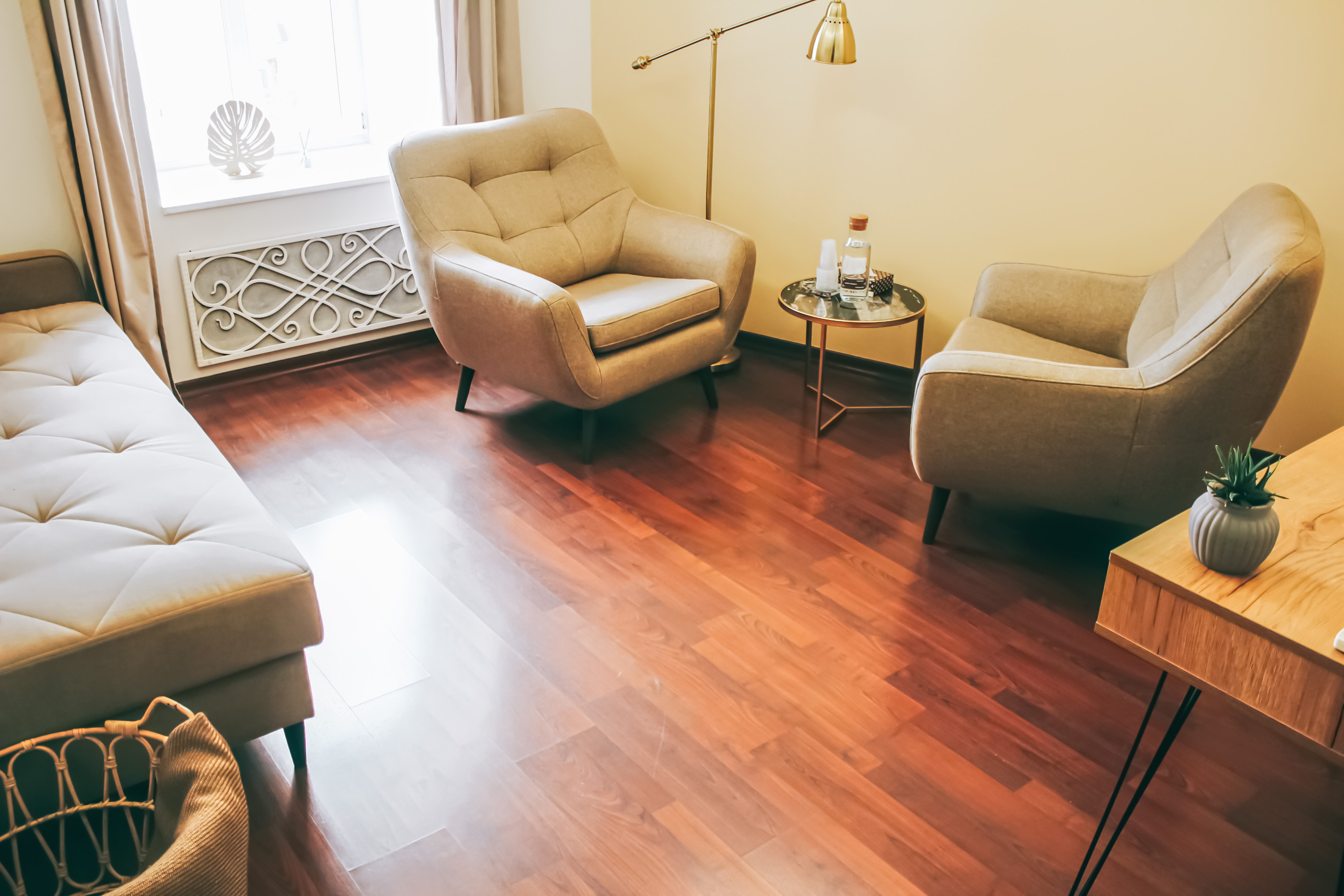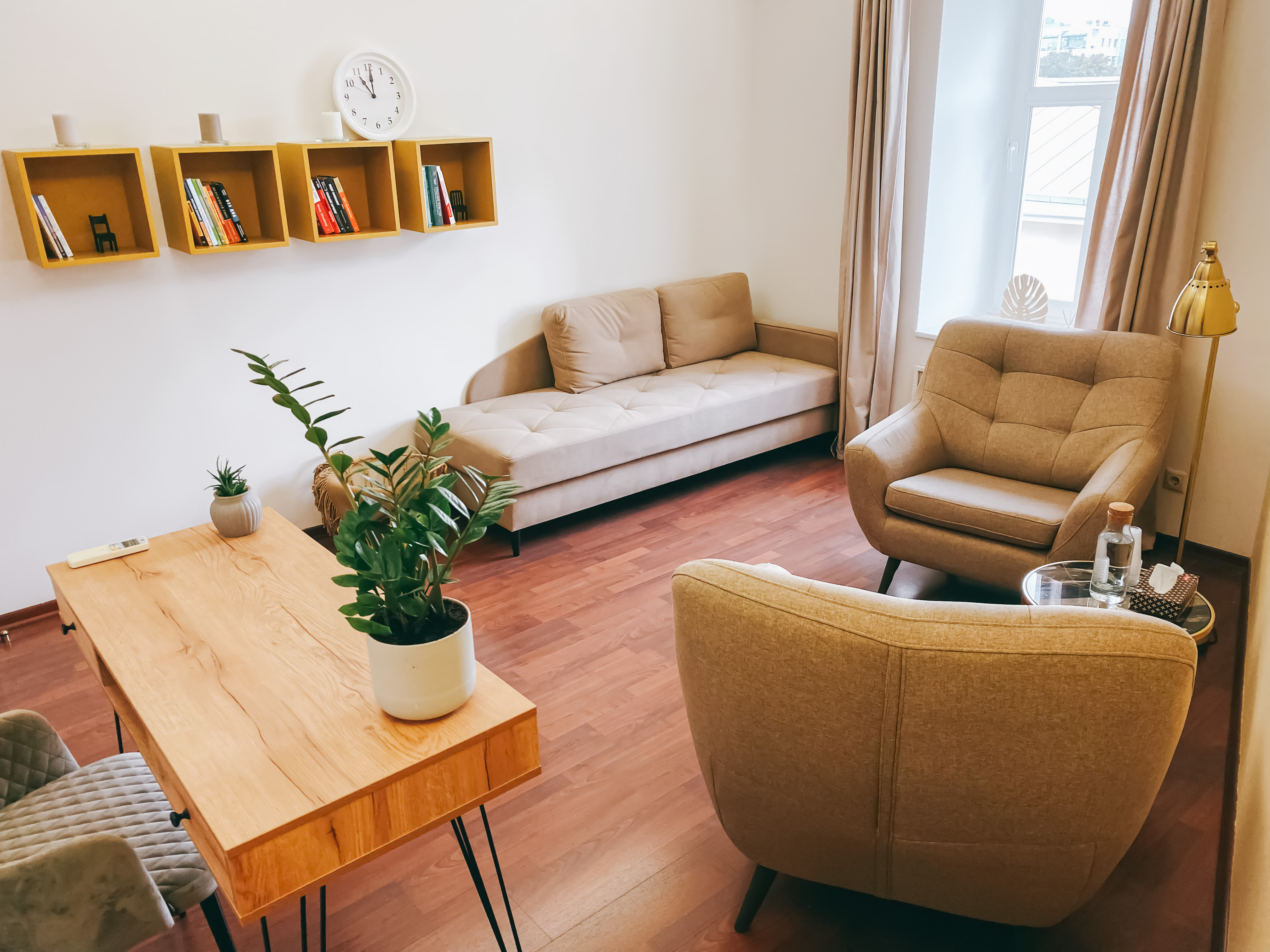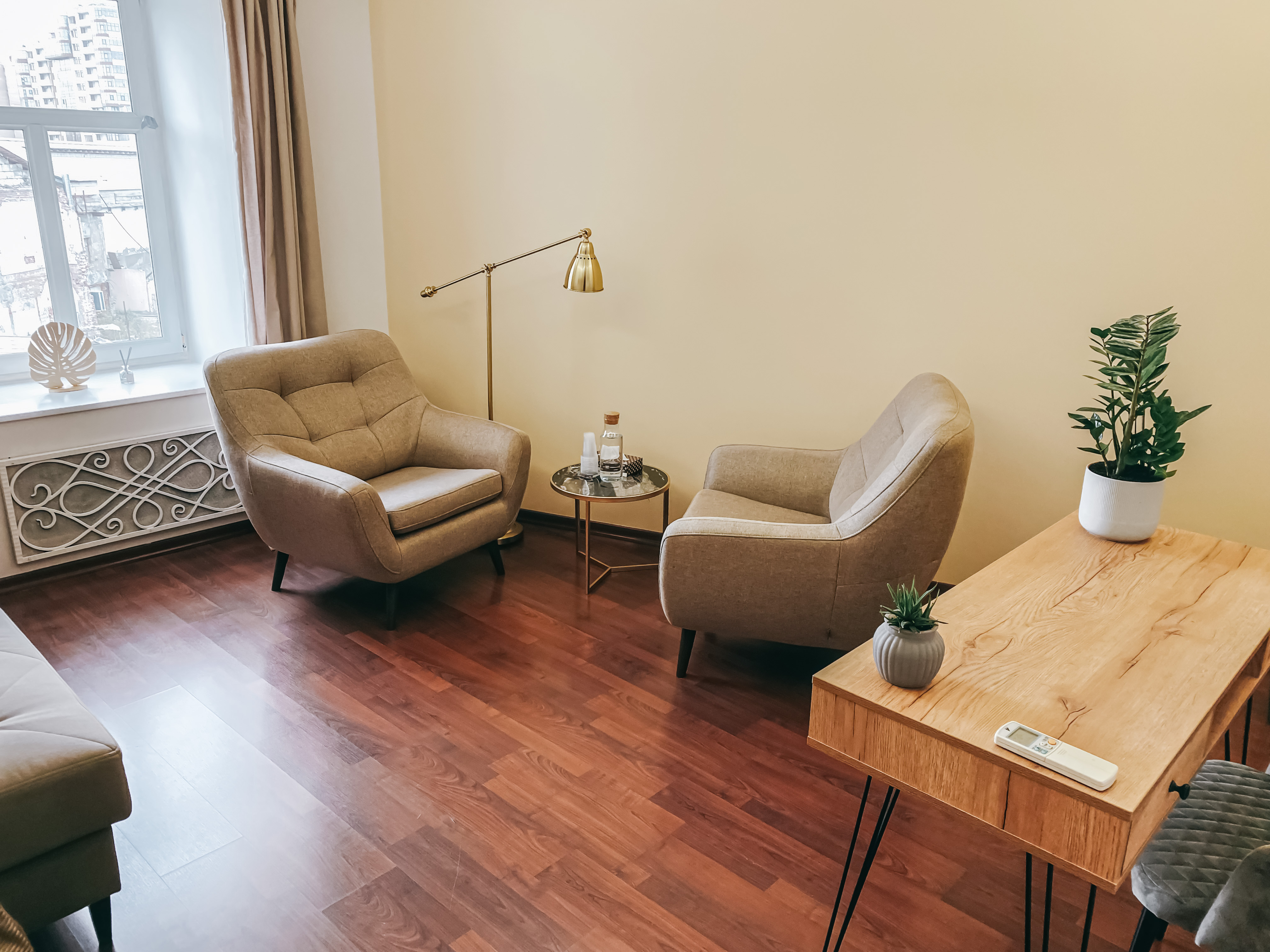 Уютный кабинет с 2-мя большими комфортными креслами и журнальным столиком. Психоаналитическая кушетка позволяет работать в этом кабинете специалистам разных практик. Мягкий местный свет торшера добавляет уюта и делает атмосферу кабинета еще более доверительной. Здесь можно проводить встречи с посетителями как очно, так и онлайн, благодаря наличию рабочего стола. Кабинет подходит для индивидуального и семейного консультирования.