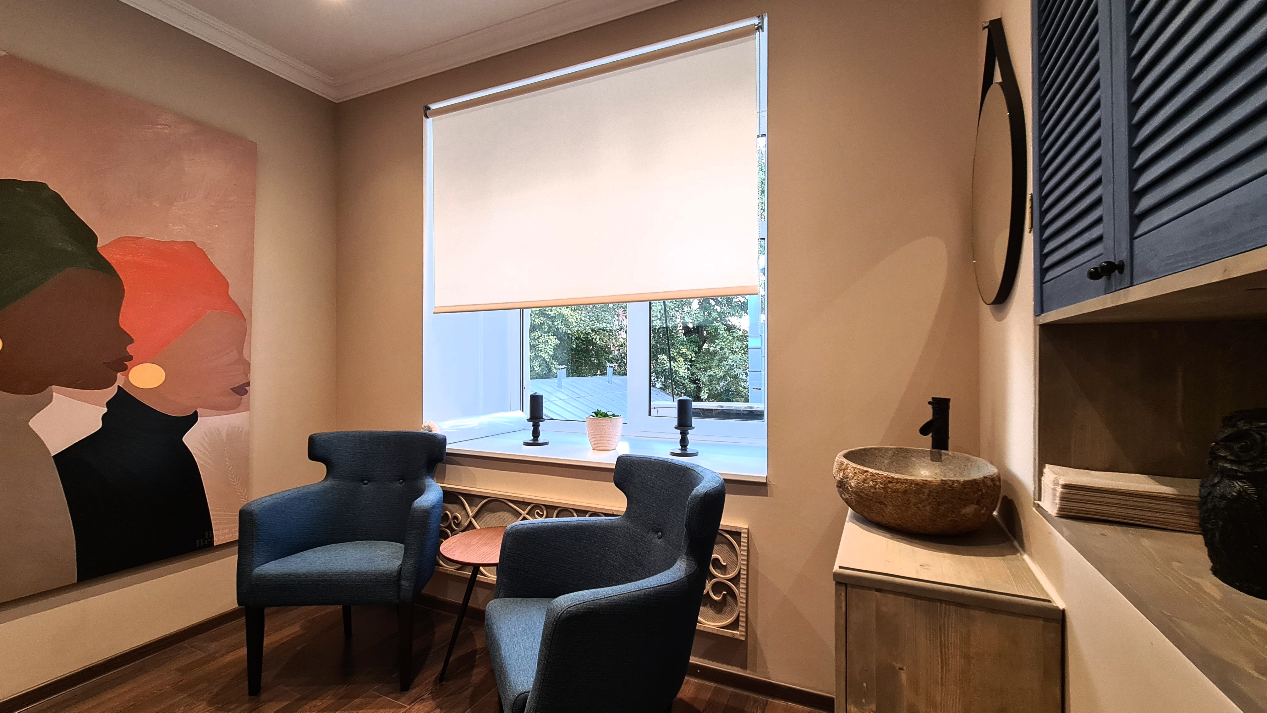 Кабинет с двумя мягкими креслами и журнальным столиком. Кабинет оформлен в спокойных тонах с применением декоративных элементов в виде винтажной раковины, зеркала, шкафчика. Одна из стен декорирована достаточно большой картиной.