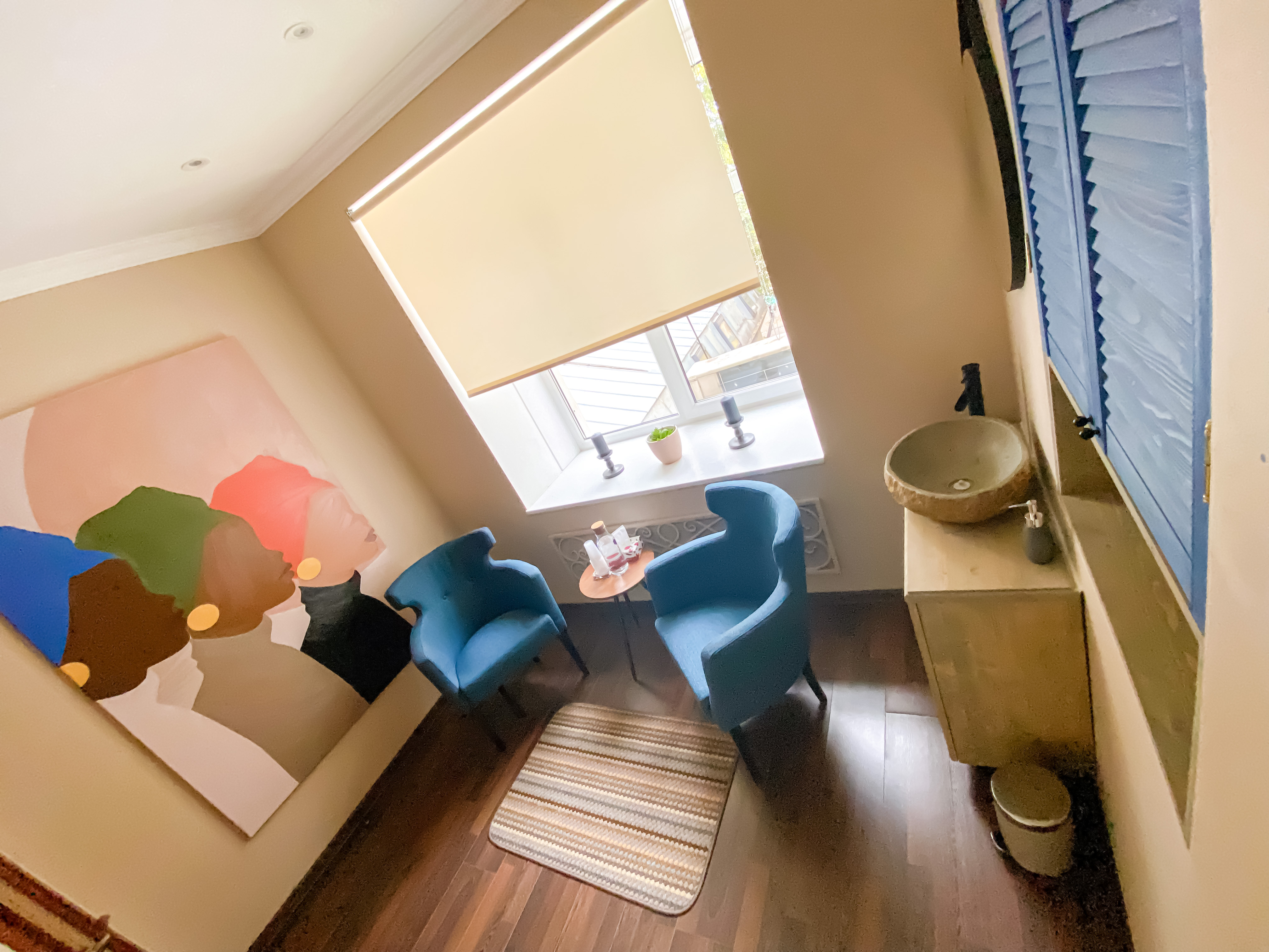Кабинет расположен на уютной мансарде с большим столом на 8 человек и флипчартом.