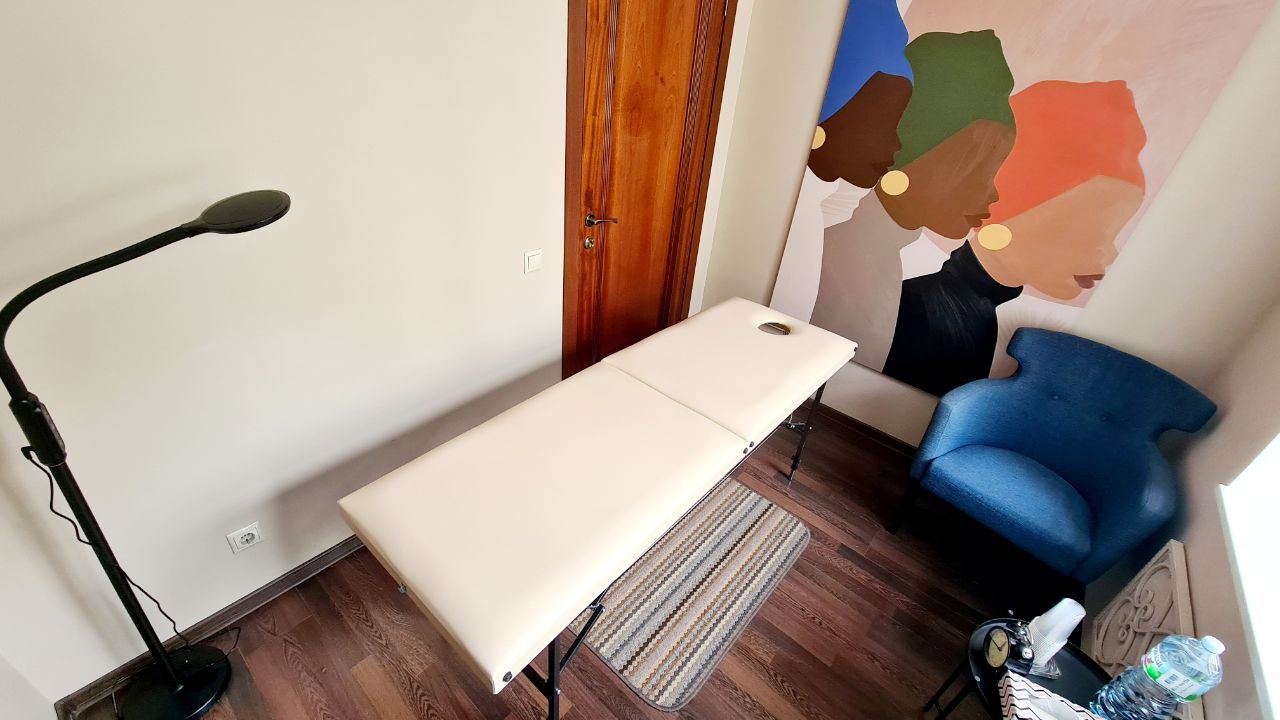 массажный стол, бутилированная вода, чай, кофе и необходимые для работы аксессуары.