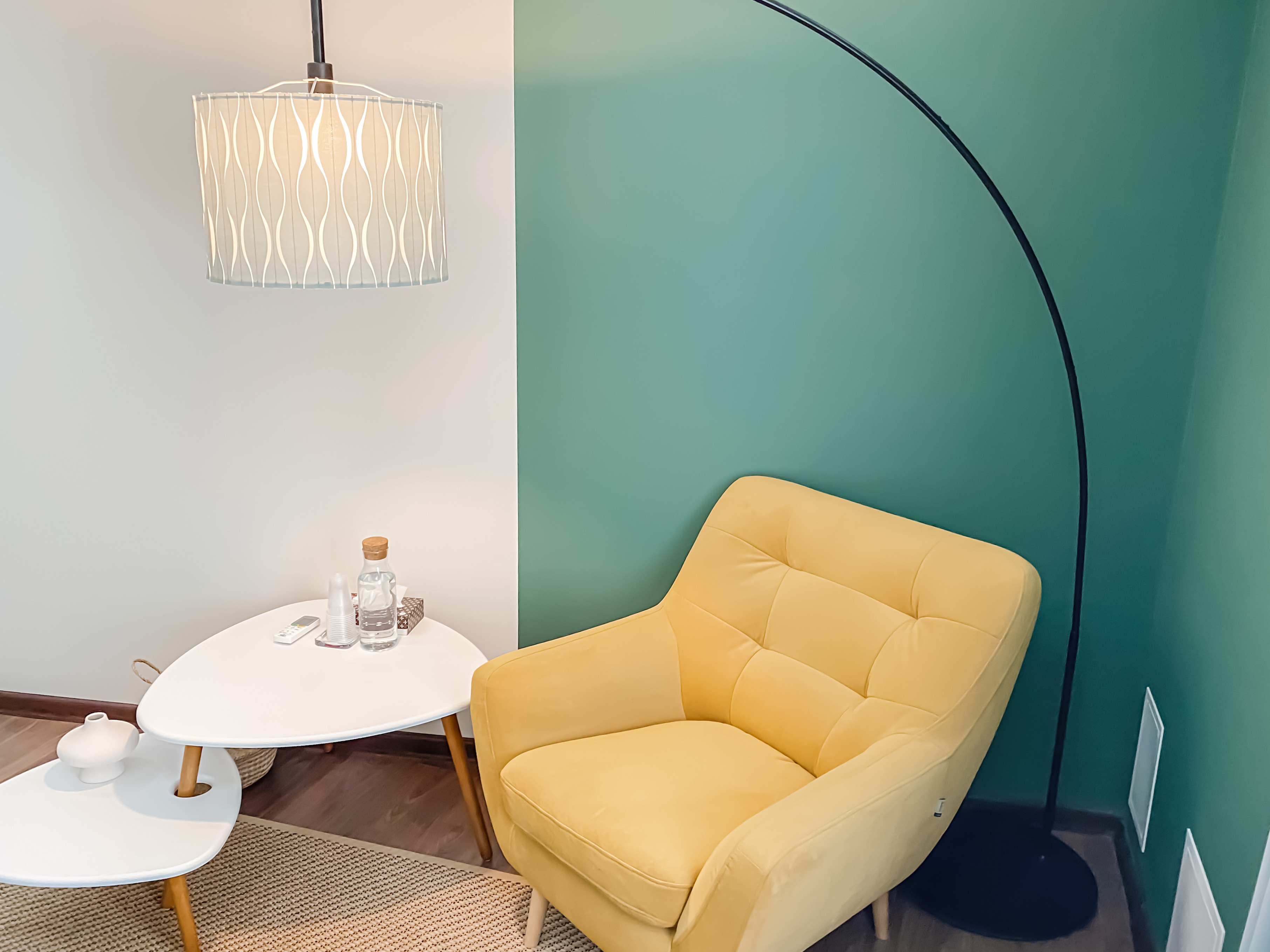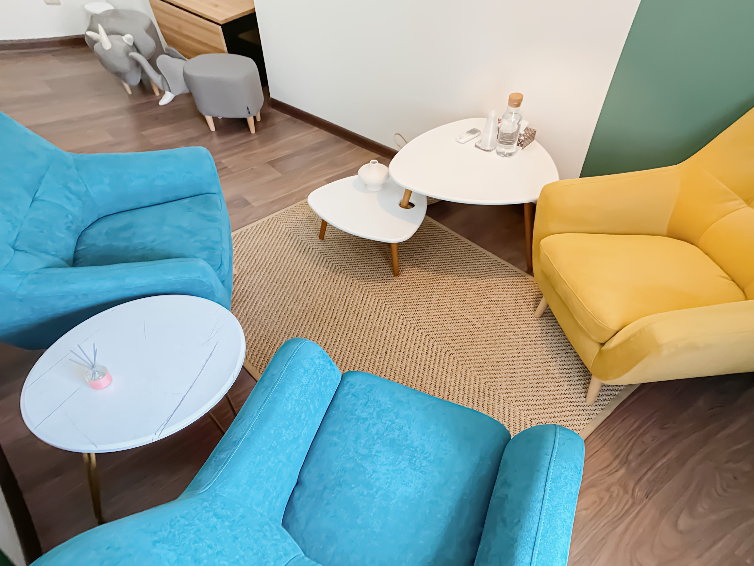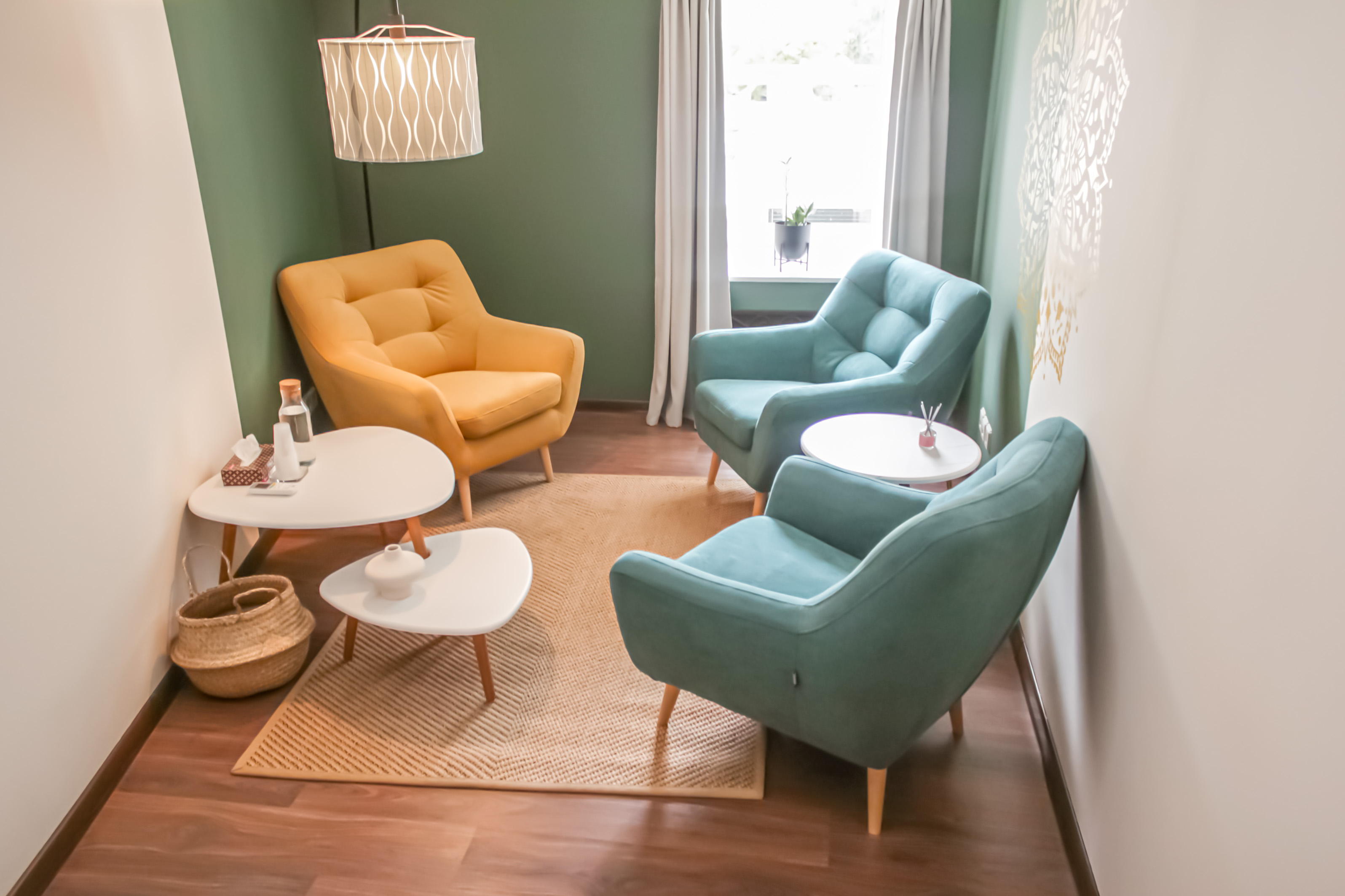 Кабинет выполнен в спокойном зеленом цвете. В интерьере 3 комфортных кресла, журнальные столики и стильный большой торшер. Живые растения придают ощущение естественности и спокойствия. На одну из стен нанесен декоративный орнамент. На полу ковер, который создает уют и поглощает лишние звуки.