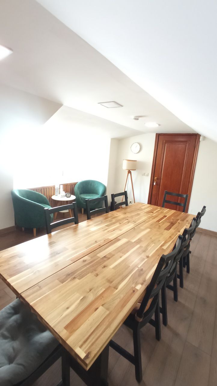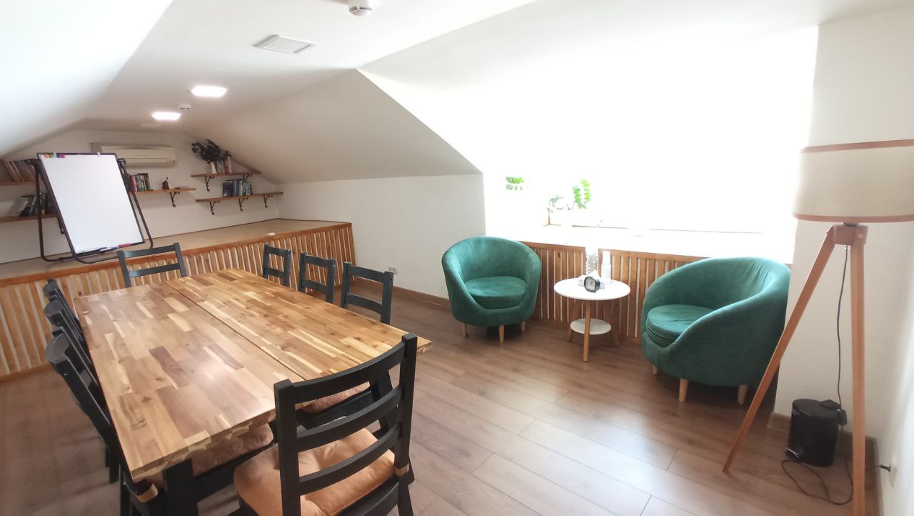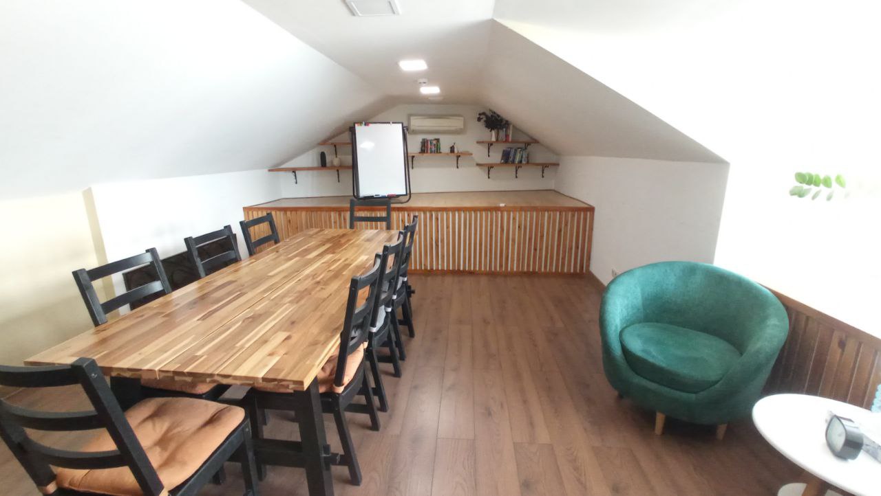 Оригинальный кабинет в мансарде. Необычная конструкция потолка делает его просторным и уютным одновременно. В кабинете стоит большой стол и 8 стульев. Также в комплект мебели входит маркерная доска. Специалисты используют его для проведения игр, арт-терапии и творческих мастерских. Вместе с тем, он будет удобен для групповых встреч, онлайн мероприятий и деловых переговоров.