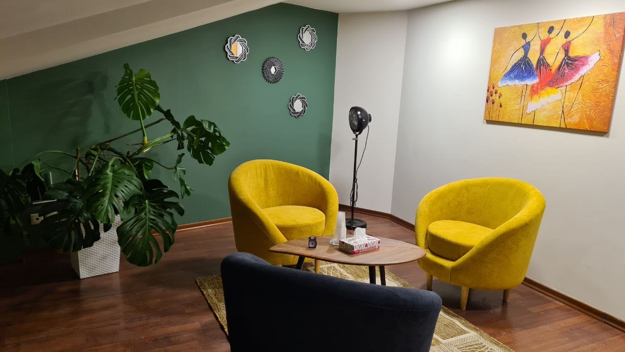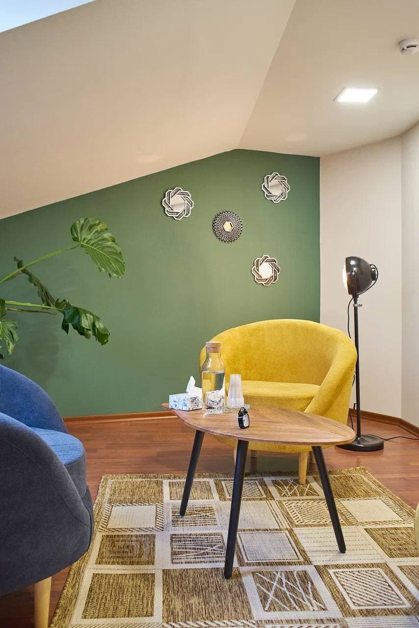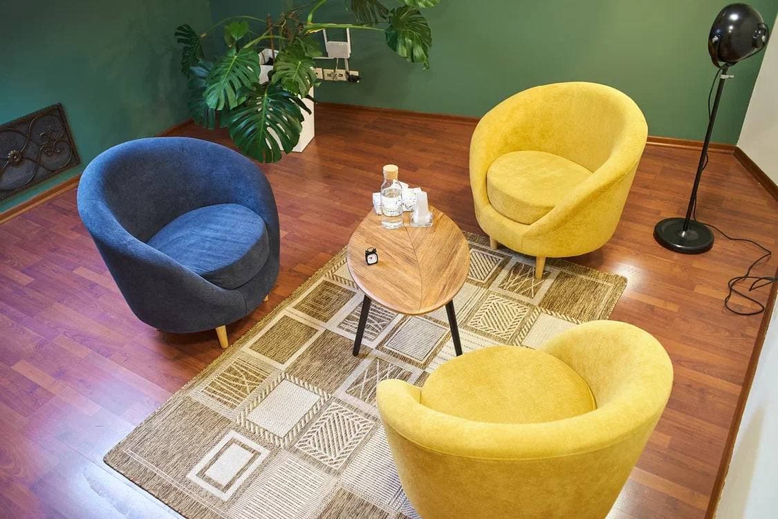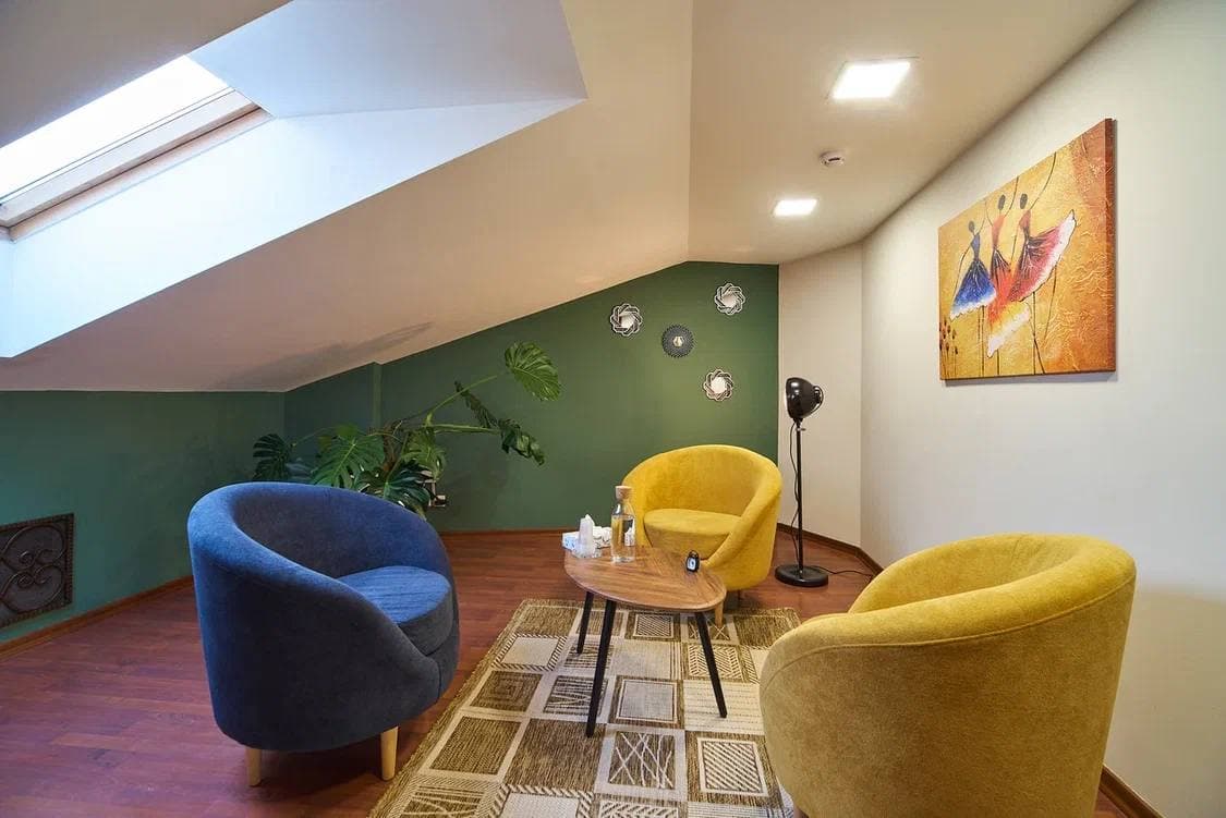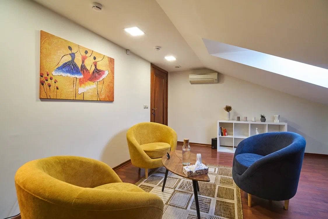 Мансардный кабинет с тремя креслами, журнальным столом, напольной лампой и стеллажом для книг. Он будет удобен для индивидуальной работы, а также с семьями или подростками. В кабинете мансардное окно, которое можно открыть в летнее время. Работа в мансарде может приобретать определенный колорит и придает ощущение большей уединенности, что может помогать терапевту и клиенту.