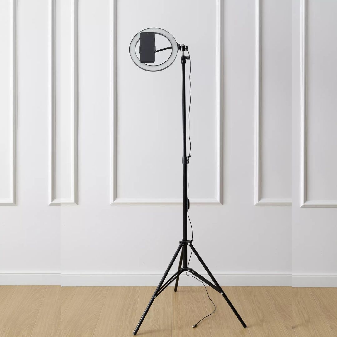 Лампа (диаметр 20 см) со штативом.Регулируемая яркость, 3 цвета — тёплый, холодный, нейтральный.Есть держатель для телефона.