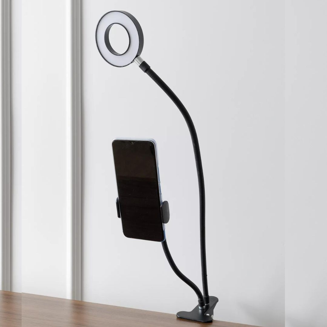 Небольшая кольцевая лампа (диаметр 9 см.) на прищепке. Длина гибкой ножки 60 см. Регулируемая яркость, 3 цвета — тёплый, холодный, нейтральный. Есть держатель для телефона.