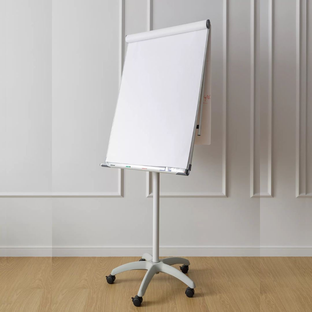 Маркерная доска с креплением для бумаги. В комплекте 4 маркера для доски (чёрный, синий, красный, зелёный), губка для стирания, листы для презентаций, а также маркеры для бумаги.