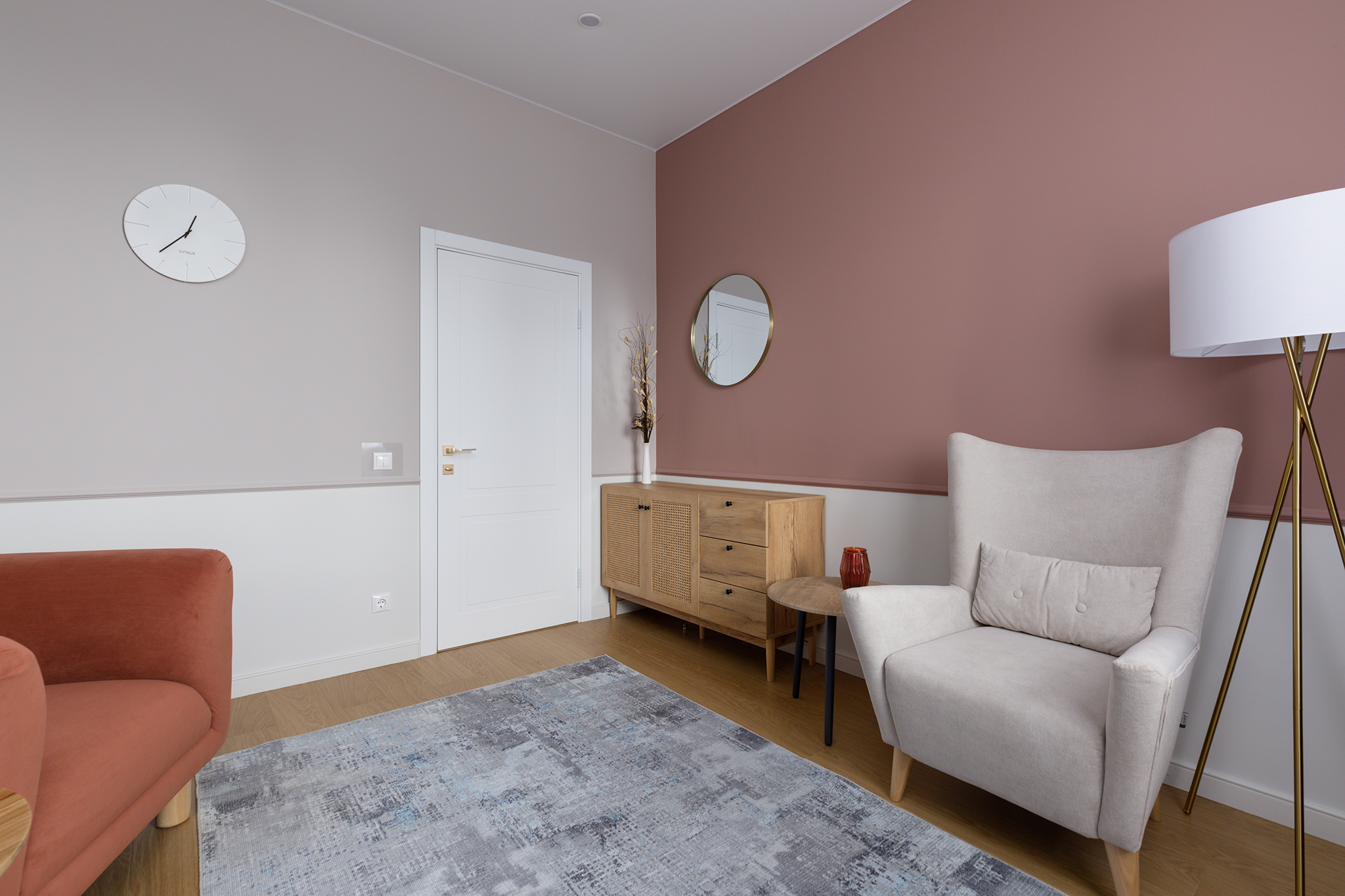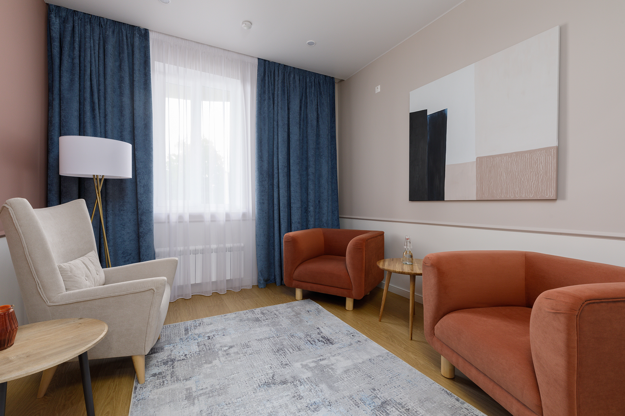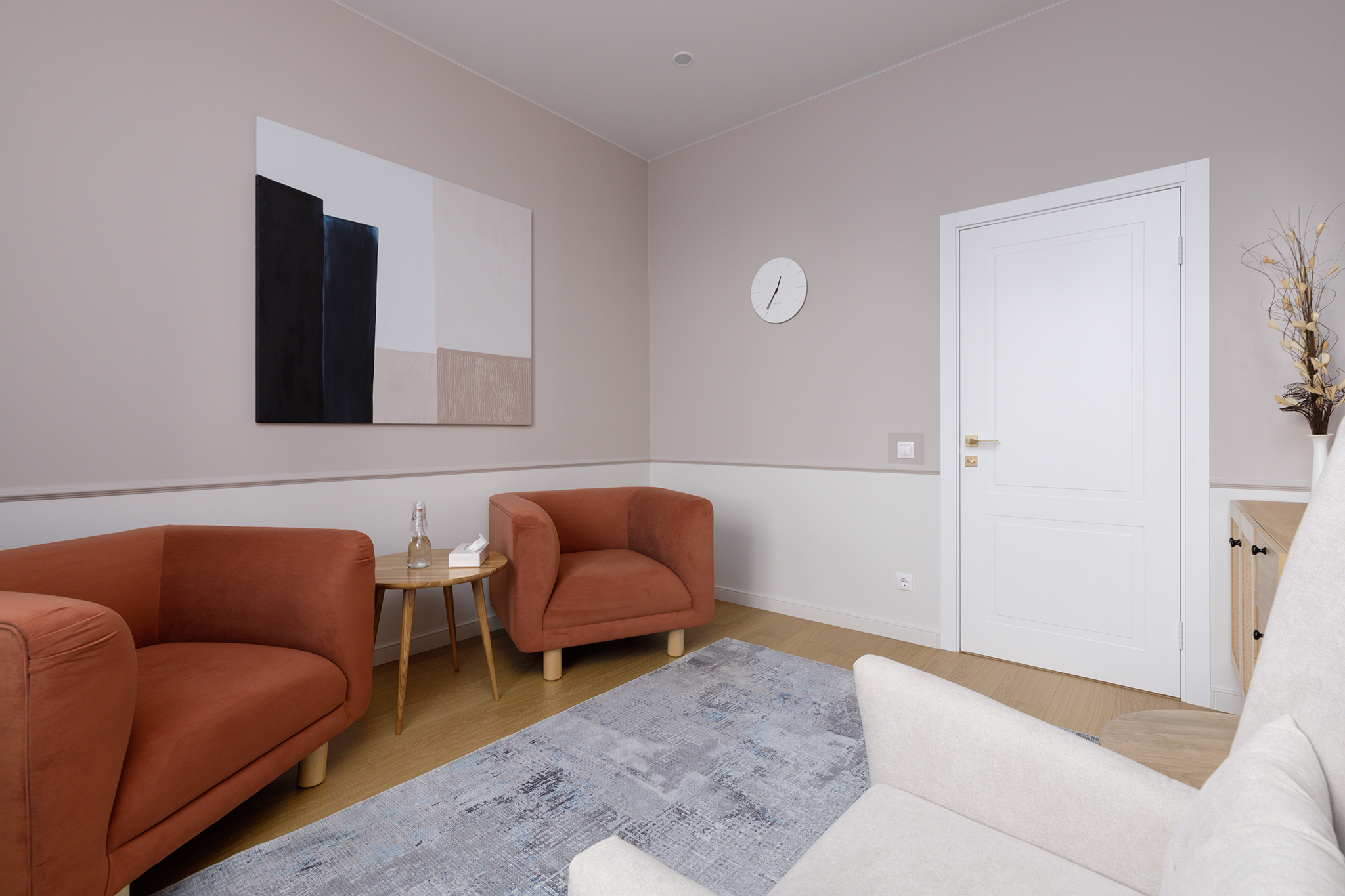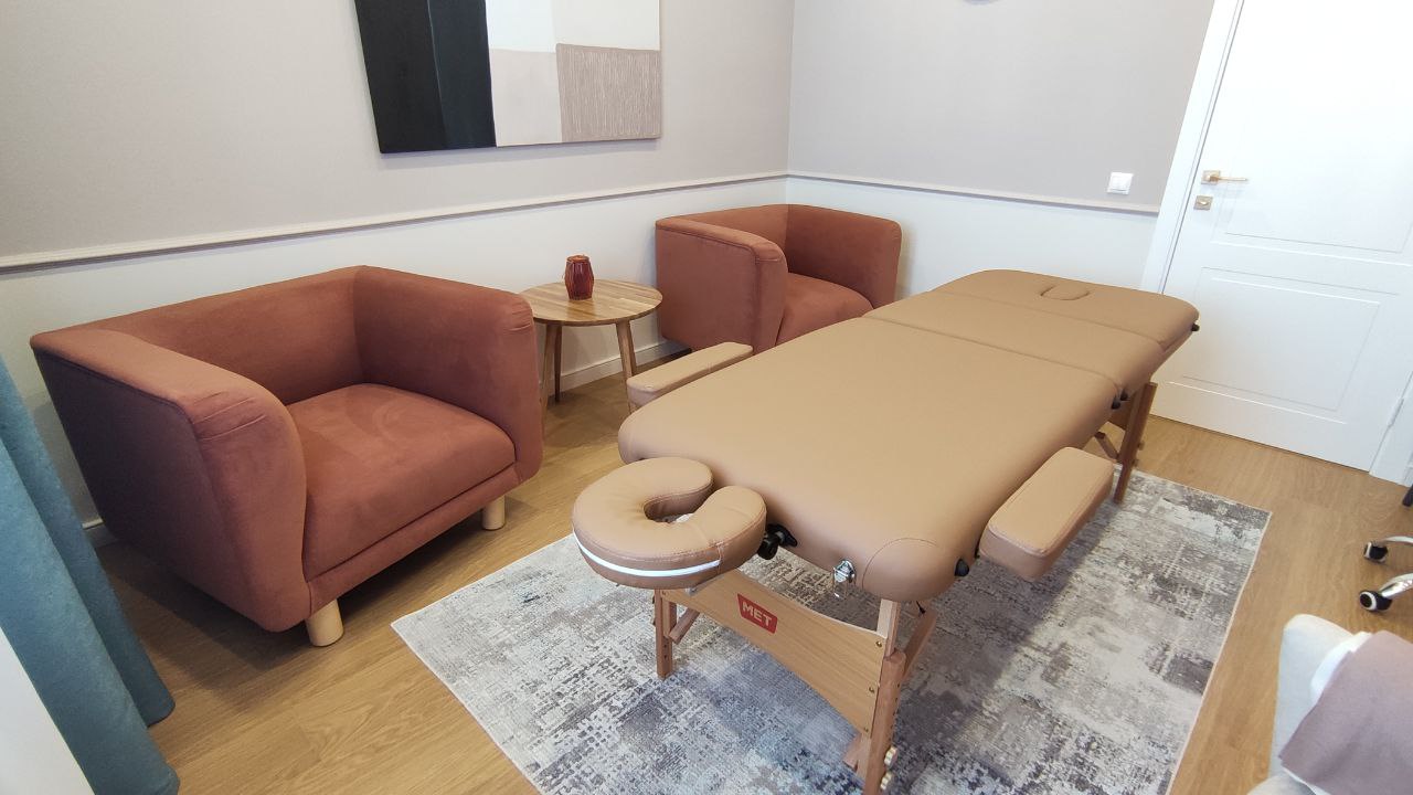 Кабинет идеально подойдёт для индивидуальной работы, семейной терапии, также пространство позволяет разместить массажный стол. Имеет небольшое окно, выходящее в тихий двор. Оснащён двумя мягкими дизайнерскими креслами и одним большим удобным креслом с высокой спинкой. Выполнен в спокойных тонах с контрастными элементами. Предусмотрено несколько уровней освещения, в том числе торшер.