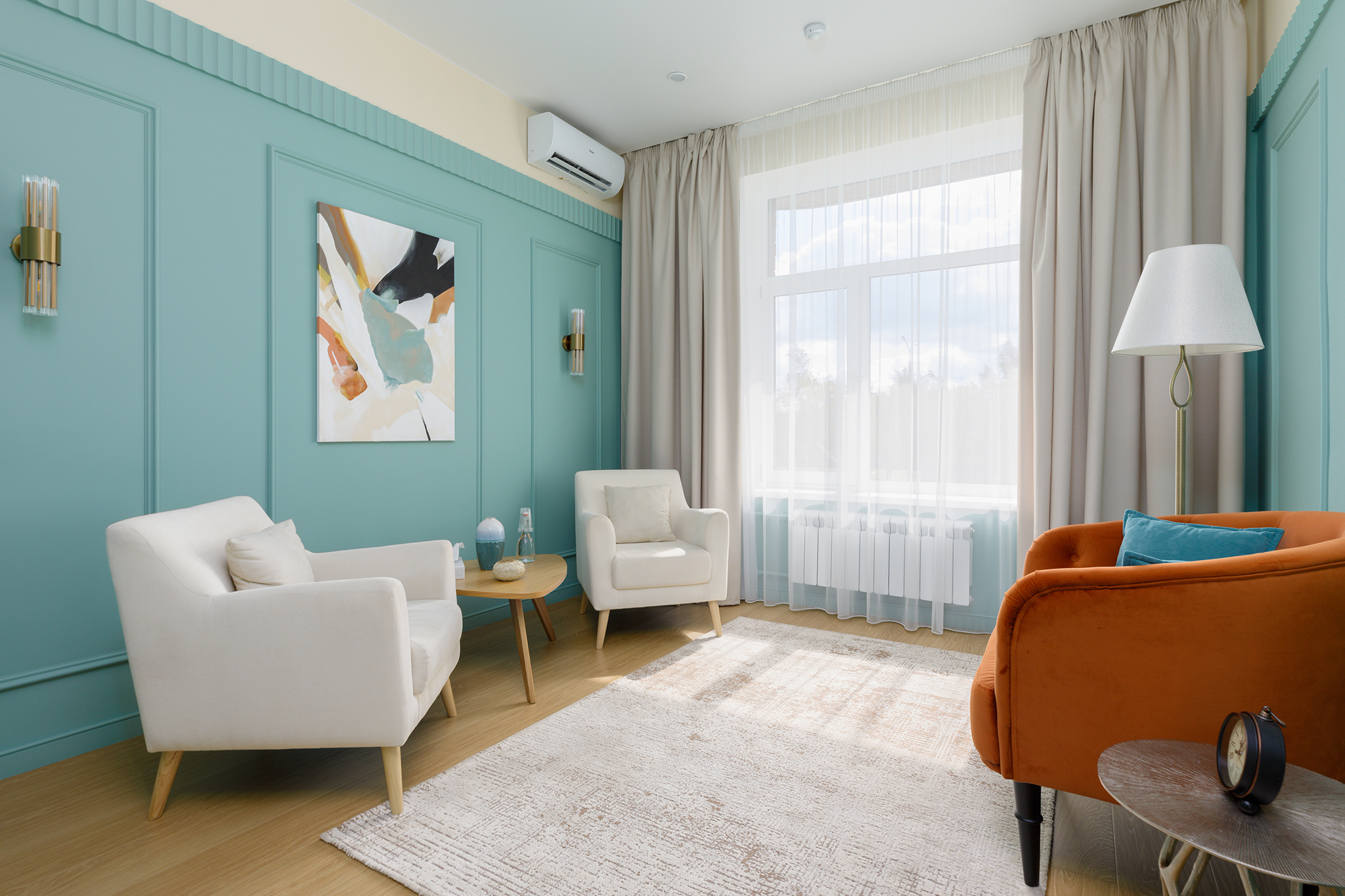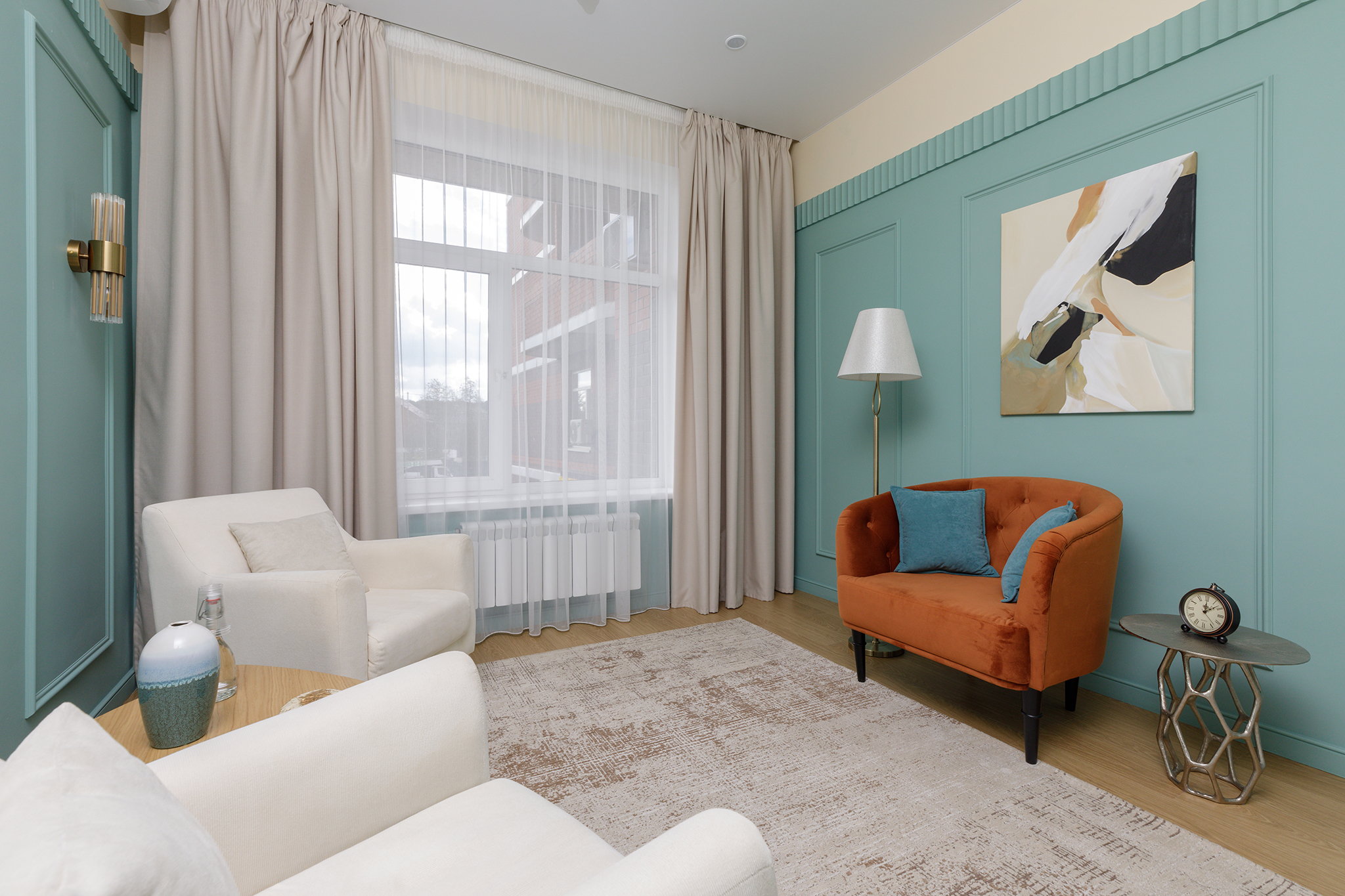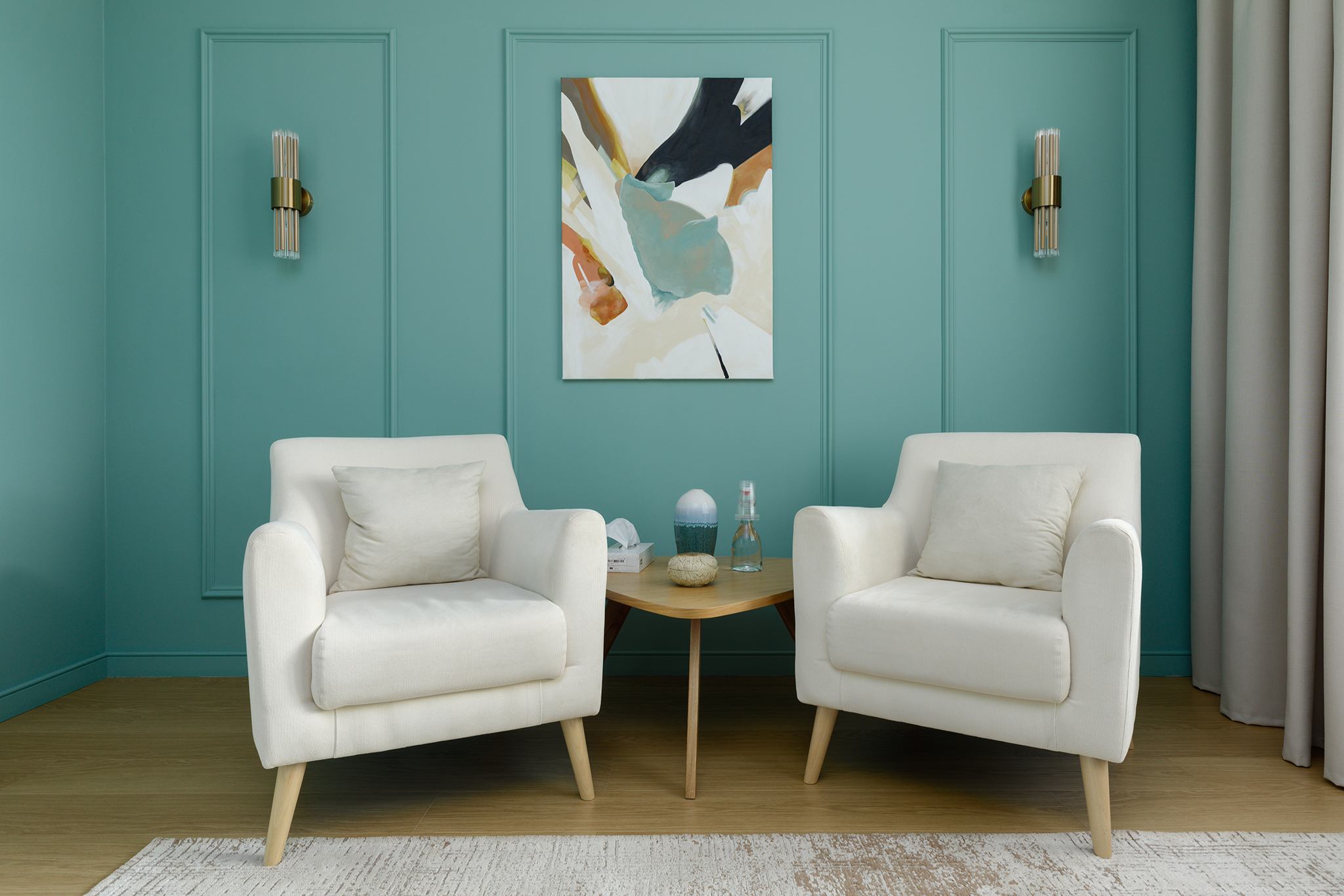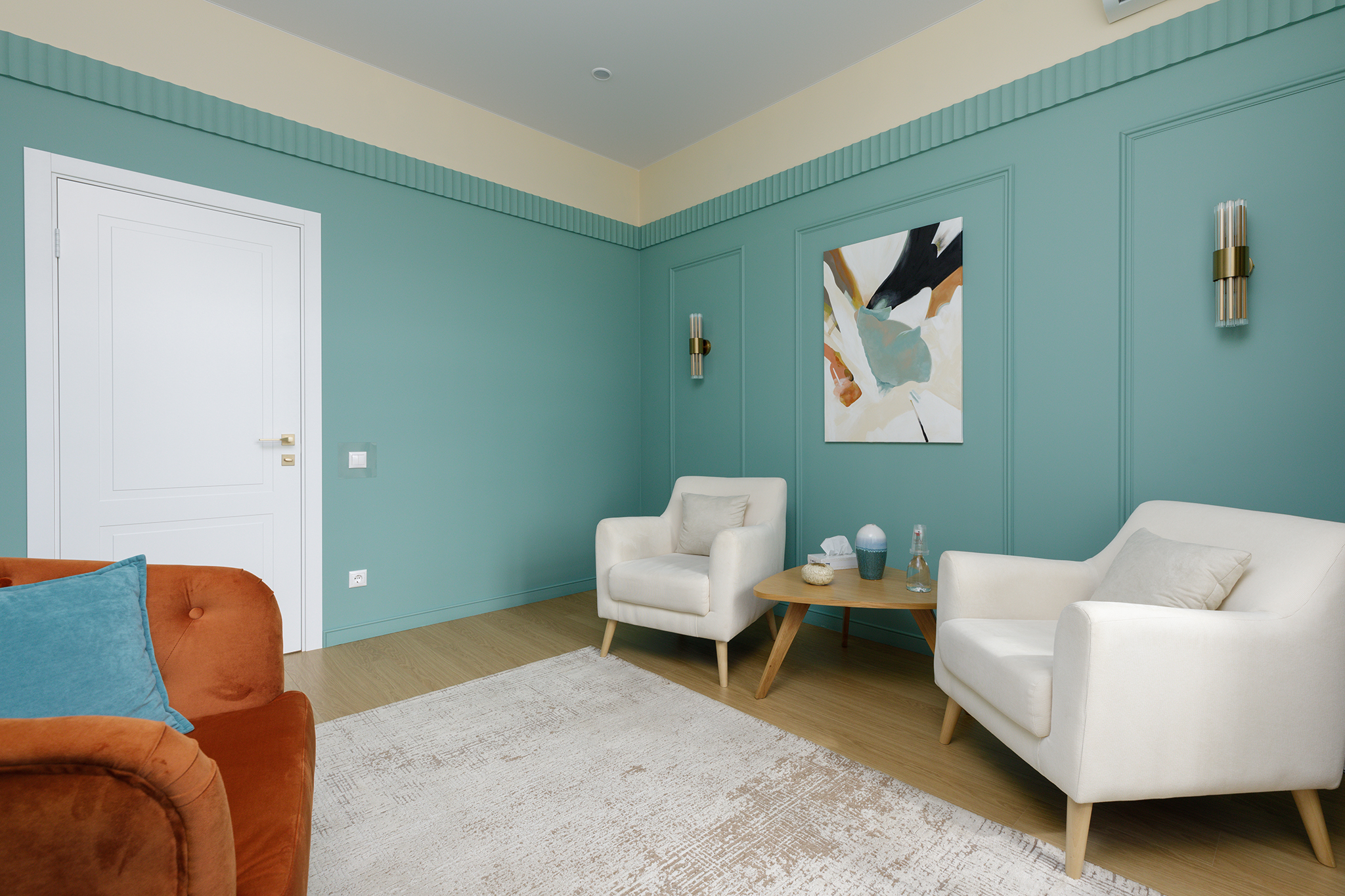 Кабинет, выполненный в бирюзово-бежевых тонах, хорошо подойдет для индивидуальной работы и семейной терапии. Имеется большое окно, выходящее на южную сторону, благодаря чему днем очень светло, и яркое солнышко скрасит ваши трудовые будни. Кабинет оснащён тремя мягкими креслами и двумя журнальными столиками. Предусмотрено несколько уровней освещения, в том числе торшер и бра.