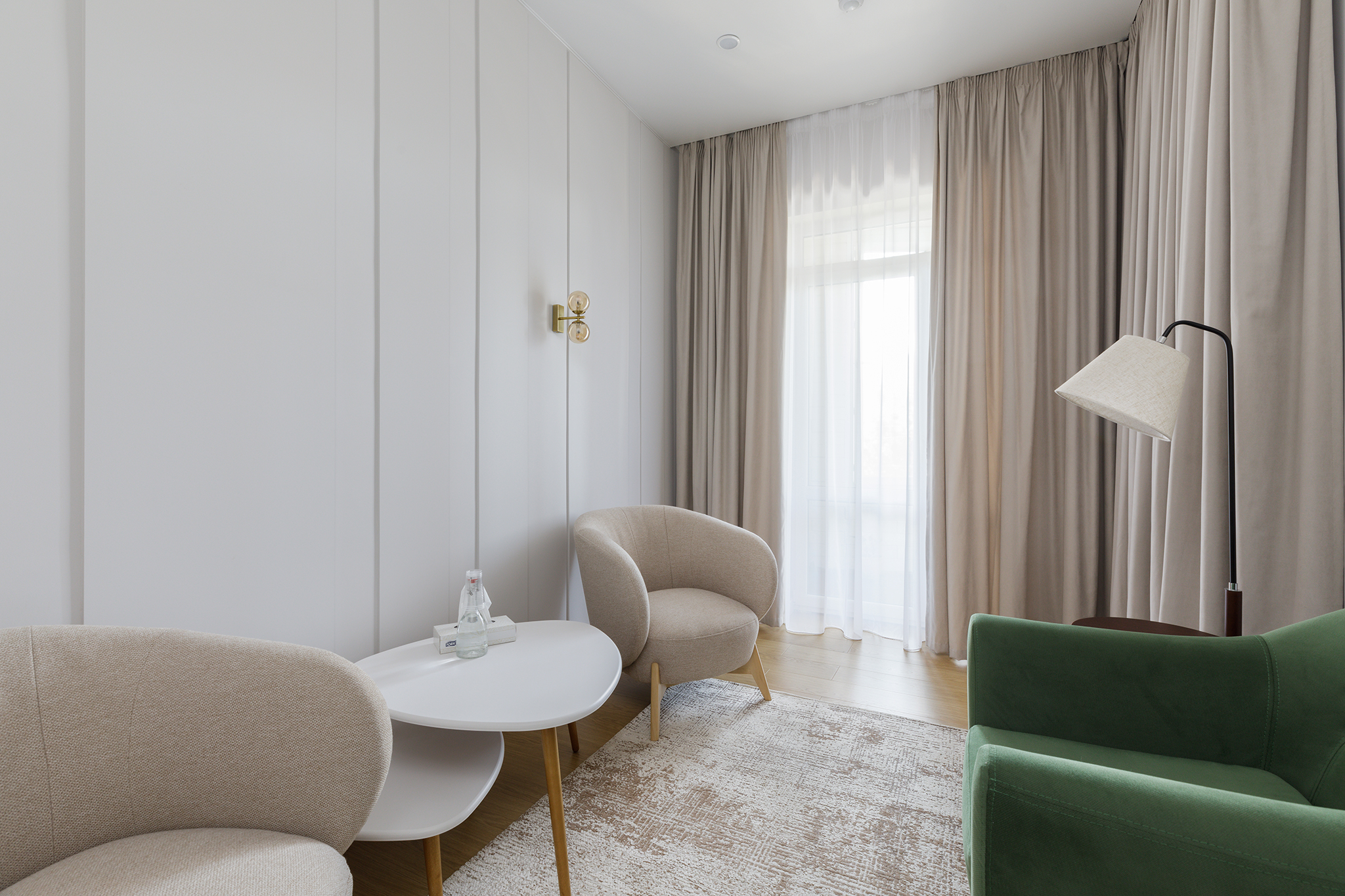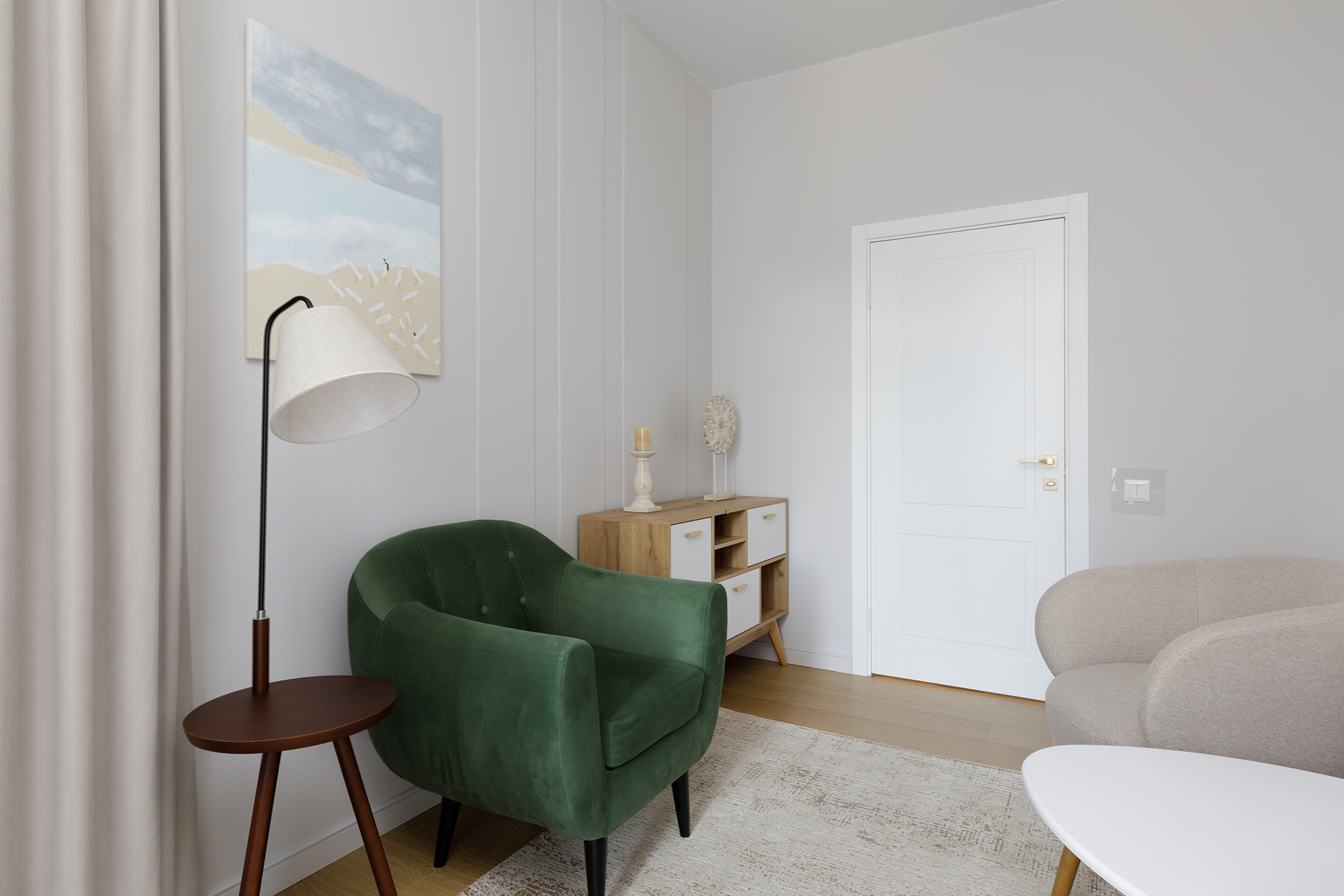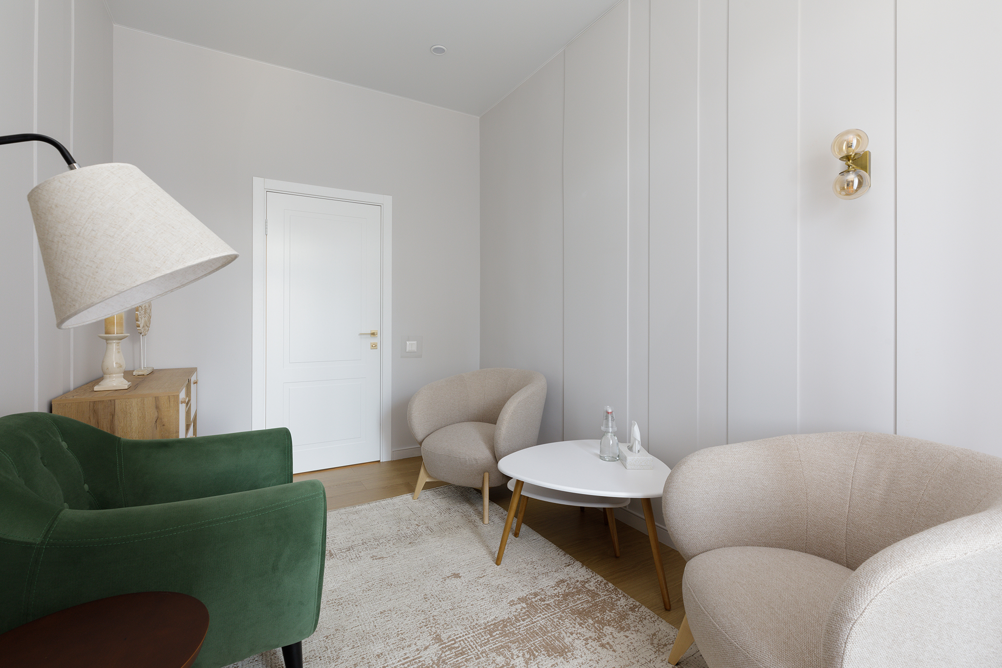 Небольшой уютный кабинет, выполненный в светлых тонах с контрастными цветовыми элементами, идеально подойдет для индивидуальной работы. Кабинет оснащен тремя креслами и журнальным столиком Предусмотрено несколько уровней освещения, в том числе бра и торшер. Есть возможность выхода на остекленную лоджию.